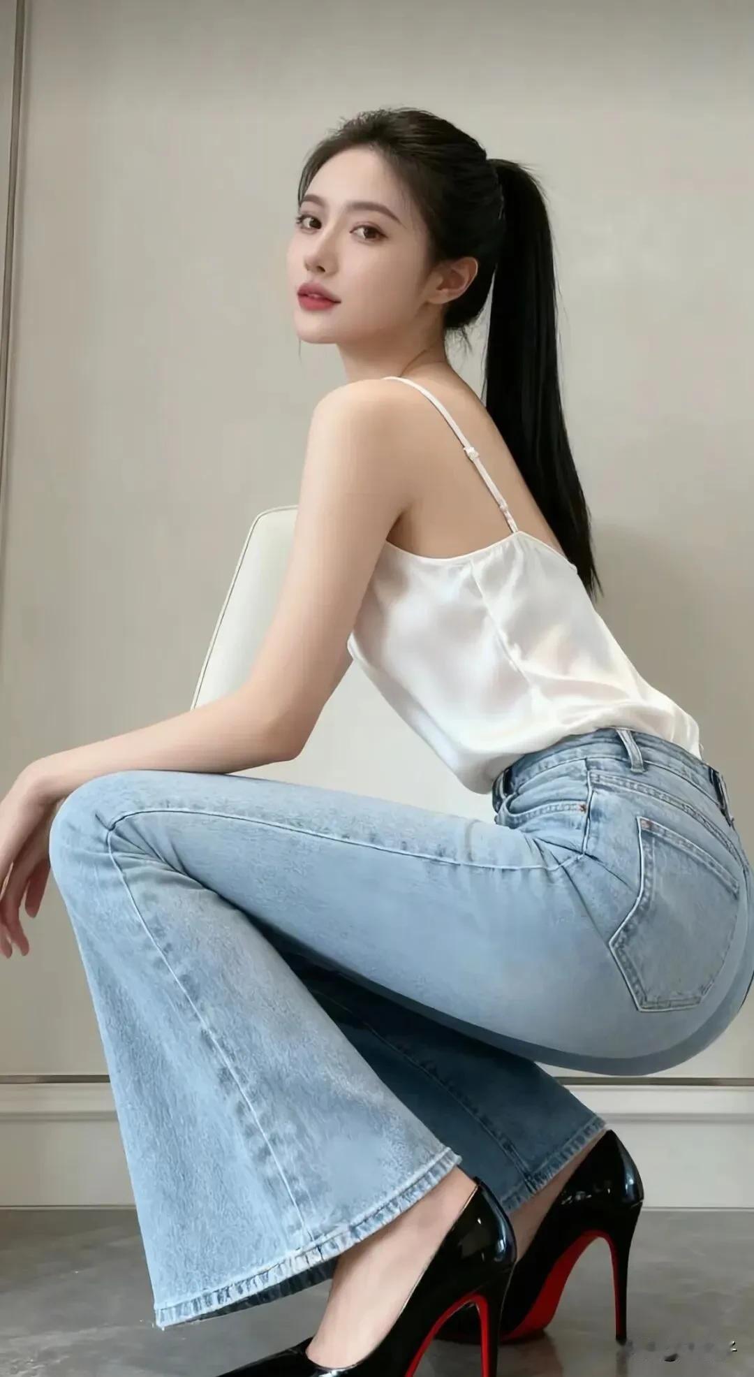 复古风穿搭,高腰牛仔裤搭配白色吊带背心,红黑高跟鞋,尽显优雅气质。