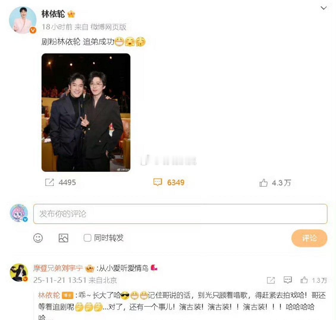 林依轮催刘宇宁拍戏 林依轮这一“催”,可真是催到了大家心坎上!刘宇宁在内娱就是勤奋与敬业的代名词,劳模、卷王的称号实至名归。他不断挑战自我,在演艺道路上稳步前行,用一部部作品证明自己的实力,未来可期,坐等新剧!