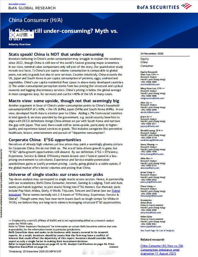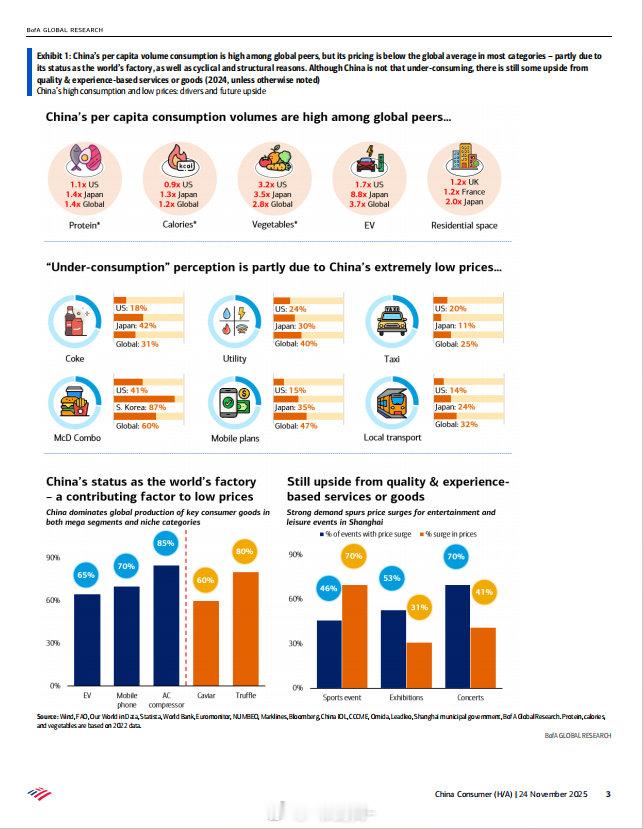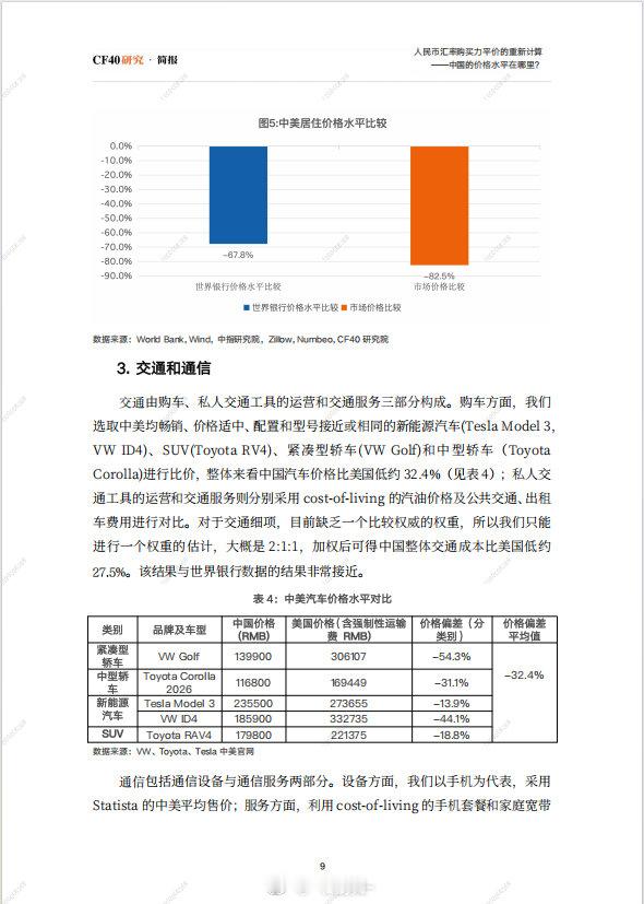 人民币5000元,到底等于美元多少钱?----等于2100美元!过去一个月,各大机构和媒体都在讨论一个问题:人民币汇率被低估,应该升值了,而围绕人民币讨论的下一个热点正在逐步形成——如果仅以市场汇率或传统 PPP 作为尺度,中国的经济体量、居民消费能力与生活水平,存在被系统性低估的问题。所以中国金融四十人研究院和美国银行都围绕这个问题各出了一篇研报,挺有意思的,我就来当个免费劳力,把研报里的观点和数据拉出来给大家看下。PPP(购买力平价)原本是被视为纠正汇率失真的工具。它试图回答“本国货币在本国能买到多少真实的商品和服务”。从逻辑上看,这一方法比直接用市场汇率折算 GDP 或消费合理得多。而世界银行给出的结论是:经 PPP 调整后,中国人均消费水平大约相当于美国的六分之一左右。这个数字在统计上是严谨的,但在现实层面却高度违和。因为它意味着,中国居民在衣、食、住、行、医疗、教育等几乎所有生活维度上的实际获得感,只相当于美国的不到 20%。而这一判断,与中国社会已经普遍实现的物质条件,显然存在断裂。因此问题来了,中国居民所面对的生活成本与消费世界真实情况是什么样?在CF40的延报里,研究者直接选取居民高频消费的具体商品与服务,对中美市场价格逐项比较;而在美银的研究中,则从另一侧切入,通过卡路里、蛋白质、耐用品拥有量、住房条件以及教育、医疗等服务结果指标,系统刻画中国居民实际消费了多少。这两组数据形成了彼此的必要补充。以食品为例。PPP 重算将食品拆解为面包与谷物、肉类、乳制品、水果与蔬菜等细项,并直接对比市场价格。中国普通白面包 500 克价格约为 6–8 元,而美国同类产品约为 人民币 18–22 元;中国大米与其他谷物价格多在每公斤 5–7 元,而美国超市中大米价格普遍在每公斤22–30 元。鸡胸肉在中国约为每公斤 20–25 元,而美国为50–65 元;在这些高度日常化的食品细项上,中国价格普遍为美国的 25%–40%。如果只看到价格,容易误以为“便宜源于少消费”;但美银的数量数据恰恰否定了这一解释。其研究显示,中国居民人均每日卡路里供应量已达到并略高于日本水平,蛋白质摄入量亦与日本接近、显著高于多数中等收入国家。换言之,在食品这一最基础的消费维度,中国并不存在“吃得少”,而是在“吃得并不少”的前提下,面对一个显著低于美国的价格体系。正是在这一组合下,食品消费金额被系统性压低。在服装、鞋类与耐用消费品中,价格与数量的背离同样明显。PPP 重算显示,Levi’s 牛仔裤在中国售价多为 300–400 元,而美国为 430–580 元;Nike 跑鞋在中国约为 500–700 元,而美国常见价格为 860–1080 元,中国价格通常低 20%–40%。而美银在数量端的结论是:中国居民在鞋类、服装、电视、冰箱、洗衣机、空调等耐用品上的人均拥有量,普遍达到日本、德国等发达经济体的 50%–80%。其中,电视、冰箱等家电的拥有量已接近发达国家水平,手机的普及率甚至不低于美国。这意味着,中国居民并非因为“买得少”而支出低,而是在“买得并不少”的情况下,支付了更低的单价。居住领域将这种结构性差异进一步放大。PPP 重算显示,中国居住类价格水平约为美国的三分之一。以城市中位数租金为例,中国主要城市普通两居室月租多在 4000–6000 元,而美国主要城市同类住房租金通常在 2000–3000 美元,即 1.4–2.1 万元人民币。在数量维度,美银研究指出,中国居民住房拥有率已超过 90%,人均住房面积虽仍低于美国,但已接近日本等发达经济体水平。这意味着,在“住”这一核心生活维度,中国居民以远低于美国的货币支出,获得了并不低的实物条件,而这一点在以金额为核心的国际比较中几乎完全被忽略。医疗与教育等服务消费中,价格与数量的错位更为典型。PPP 重算选取“日均住院费用”作为可比指标,中国约为 1100–1300 元,而美国约为 3000 美元左右,折合人民币 2 万元以上,中国价格仅为美国的约 5%。在教育中,中国公立高校本科阶段年学费多在 5000–8000 元,而美国公立大学州内学费通常在 1–2 万美元区间。如果仅看价格,容易得出“中国医疗、教育支出很低”的结论;但美银从结果指标给出的判断是,中国居民的预期寿命已接近日本,预期受教育年限亦达到发达国家的 90% 左右。这意味着,中国并非通过压缩医疗与教育消费来实现低支出,而是在极低价格条件下,实现了高覆盖与高使用率。在服务消费的其他领域,这一模式反复出现。PPP 重算显示,中国在交通、通信、餐饮与文化娱乐等领域的价格普遍为美国的 30%–60%;而美银数据显示,中国居民的国内旅游人次、基础通信使用频率和日常服务消费参与度,均显著高于其人均消费金额所暗示的水平。当价格与数量被同时摆在桌面上,一个被长期忽视的事实便不再模糊:中国并不存在“普遍意义上的消费不足”。相反,中国居民在多个关键生活维度上,已经接近发达国家的实物与服务消费水平,只是这一切发生在一个被系统性压低的价格体系之中。任何仅基于消费金额,或基于未充分修正的 PPP 所做的国际比较,都会在这一结构性错位下,自动放大中国与发达国家之间的差距。而基于新的价格体系,研究重新估算了中美之间的 PPP 汇率。结果是:人民币 PPP 汇率约为 2.41,而非当前世界银行使用的 3.65。也就是人民币5000元,约等于美元2100美元。
