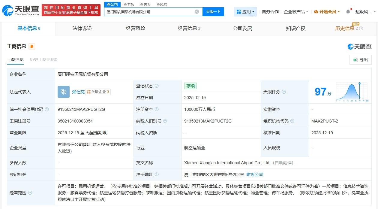 厦门翔安国际机场公司登记成立注册资本10亿 天眼查App显示,近日,厦门翔安国际机场有限公司成立,法定代表人为张仕亮,注册资本10亿人民币,经营范围包括民用机场运营、旅客票务代理、航空运输货物打包服务、装卸搬运、国内货物运输代理等。股东信息显示,该公司由厦门翔业集团有限公司全资持股。 天眼查信息:
