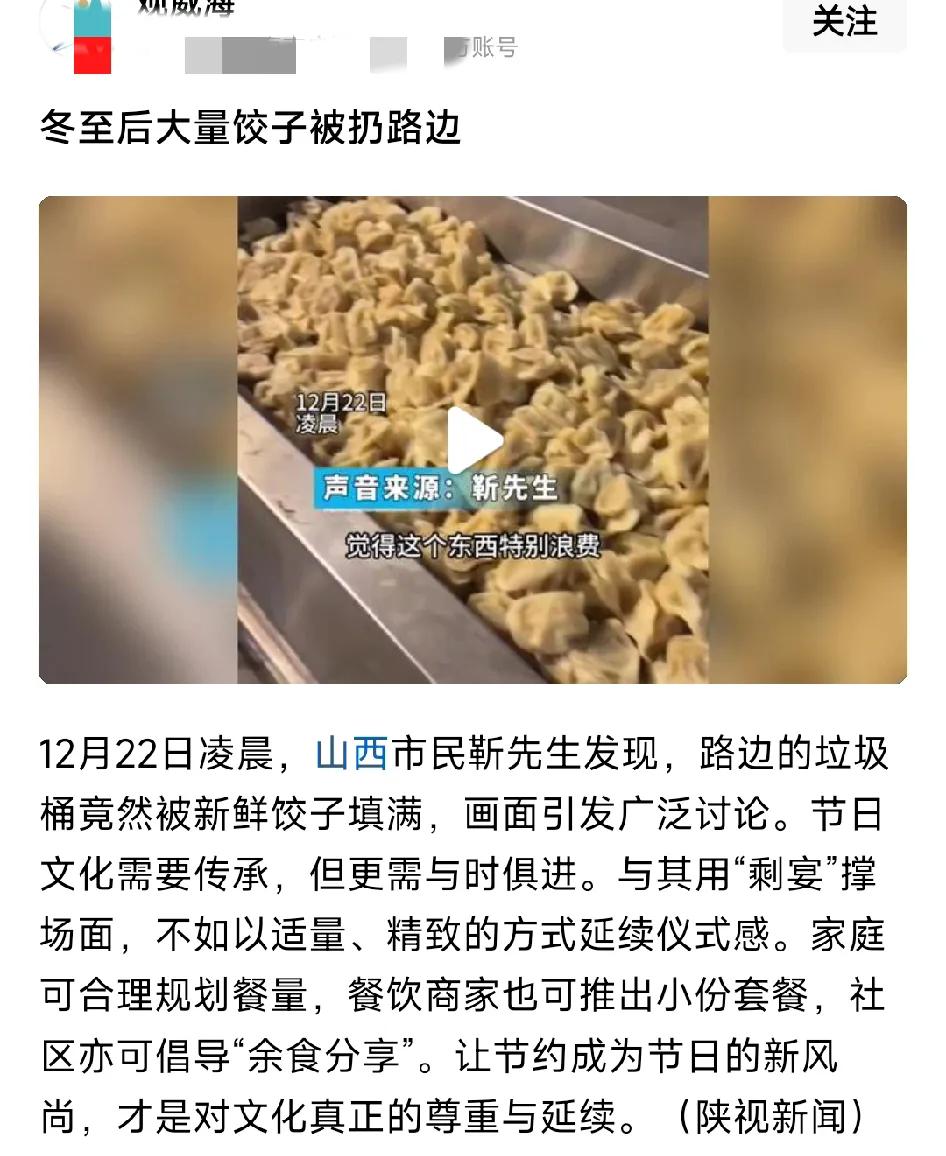 现在粮食都已经多余到这种程度了吗?山西市民靳先生发现,路边的垃圾桶竟然被新鲜饺子填满。与其用“剩宴”撑场面,不如以适量、精致的方式延续仪式感。家庭可合理规划餐量,餐饮商家也可推出小份套餐,社区亦可倡导余食分享。让节约成为节日的新风尚,才是对文化真正的尊重与延续。 应该查实一下,是饺子质量有问题?还是不爱惜粮食浪费?查明白了,该怎么罚就怎么罚。好了伤疤忘了疼!这些人没有经历大饥荒,所以如此不珍惜食物!抛开饥荒,抛开饿死,毕竟这离这些人太远了!不浪费难道不是中国人的基本素质吗?珍惜食物就是对生产食物人的尊重,就是尊重每个人,在这个把狗都要当普通人尊重的年代,这些人居然连自己的衣食父母都不尊重,这些人的素质都被狗吃掉了吗? 吃饱了撑的!应该使用粮票供应,每月多少量国家出台政策,每次看到我都非常气氛,他们没挨过饿!我70多岁的人经过那个年代,亲身体验过挨饿的滋味!想想十四亿人每天要吃多少粮食,如此不珍惜粮食,假如有一天没粮食了你们就傻眼了!剩菜剩饭打包 打包剩菜 粮食浪费现象 粮食浪费 家庭剩菜 食品垃圾食品 食物浪费现状