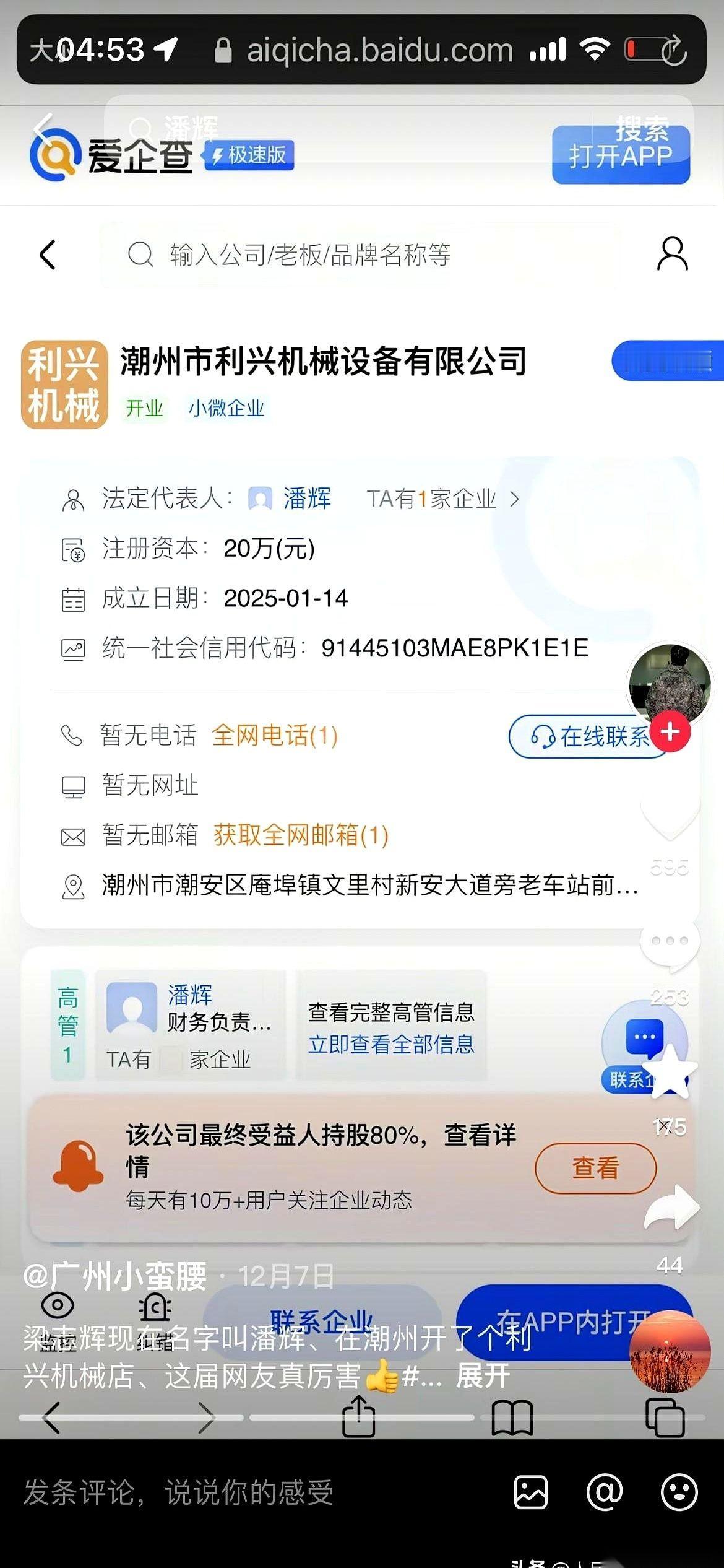我鸡皮疙瘩都起来了。 网友顺藤摸瓜,摸到了梁志辉在潮州开的机械设备公司。法人代表,叫潘辉。 梁志辉。潘辉。 看见没?同一个“辉”字。 这一下就把我干懵了。这哪是巧合,这分明是当年那家人,给他留下的一个念想,一条线索啊。冥冥之中,好像在说:我们养这个孩子,但我们把你名字里的一个字留下来了。万一呢? 就这一个细节,瞬间就觉得,这孩子当年没受苦。 也一下就理解了,为什么梁爸梁妈之前一直说在惠州,含糊其辞。那不是撒谎,那是天下父母心,想在风暴中心给儿子撑开一把保护伞,怕他被流量打扰了正常生活。 什么生活? 一个刚起步的公司老板的生活。 公司是新开的,百废待兴,所以他才会天天加班加点,忙到三更半夜才能开个直播。 他不是一个等着被“解救”的符号。他是一个活生生、热腾腾,靠自己双手打拼事业的男人。 所以你看,这故事最戳我的,不只是“找到”。 而是他被养得很好,很体面。 有自己的事业,在努力地“发辉发光”。 这个“辉”字,就是最好的证明。