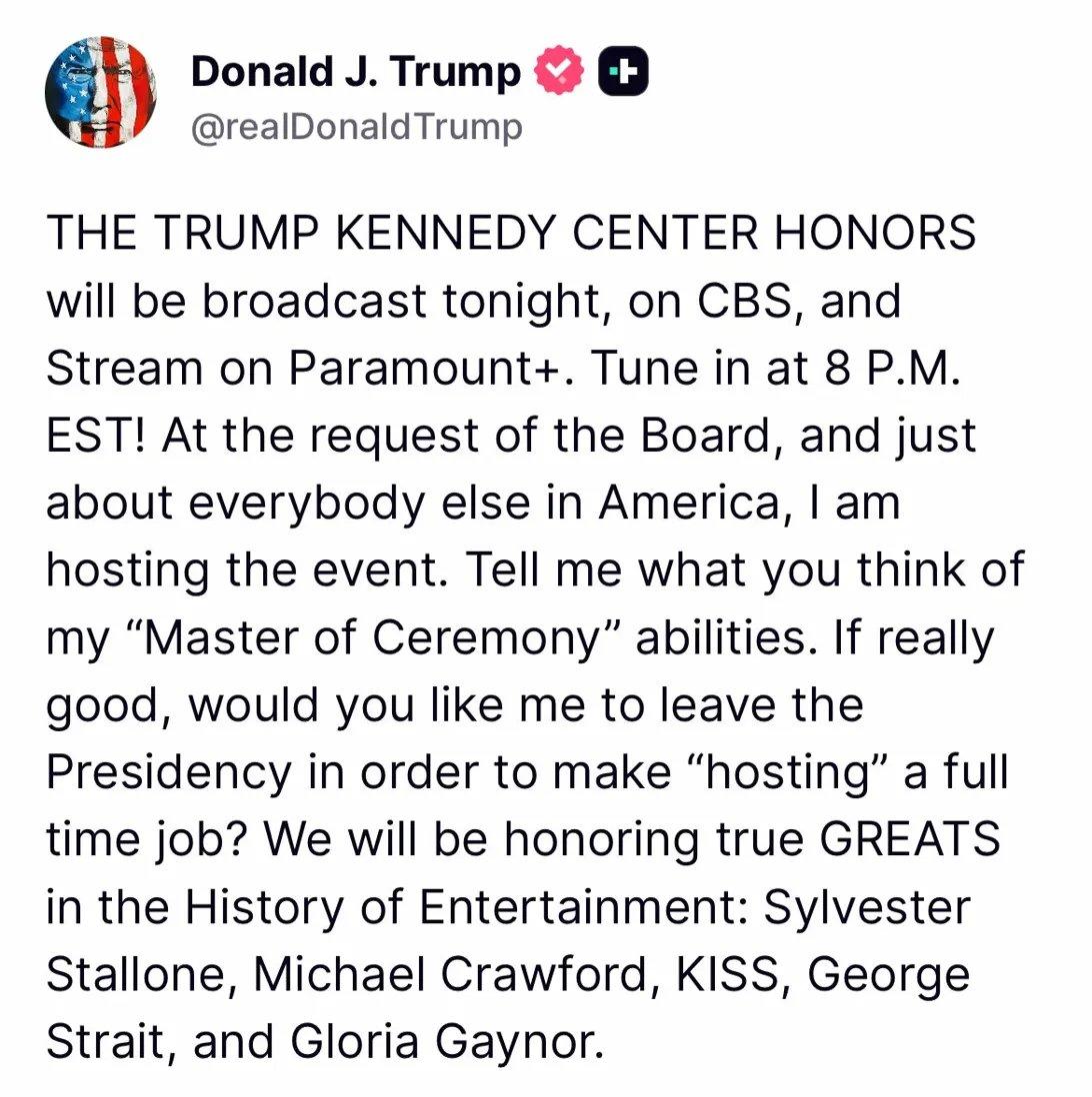 🚨🇺🇸 特朗普今晚主持肯尼迪中心荣誉奖颁奖典礼,民主党人提起诉讼,要求将他