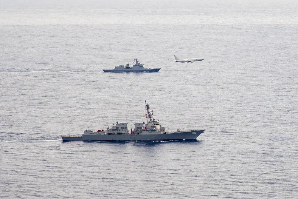 2025年12月10日,南海,美国海军P-8A“海神”侦察机在南海执行低空飞越任务,同时美国海军“阿利·伯克”级导弹驱逐舰拉斐尔·佩拉尔塔号(DDG 115)与菲律宾海军何塞·黎刹级护卫舰BRP何塞·黎刹号(FF 150)编队航行。