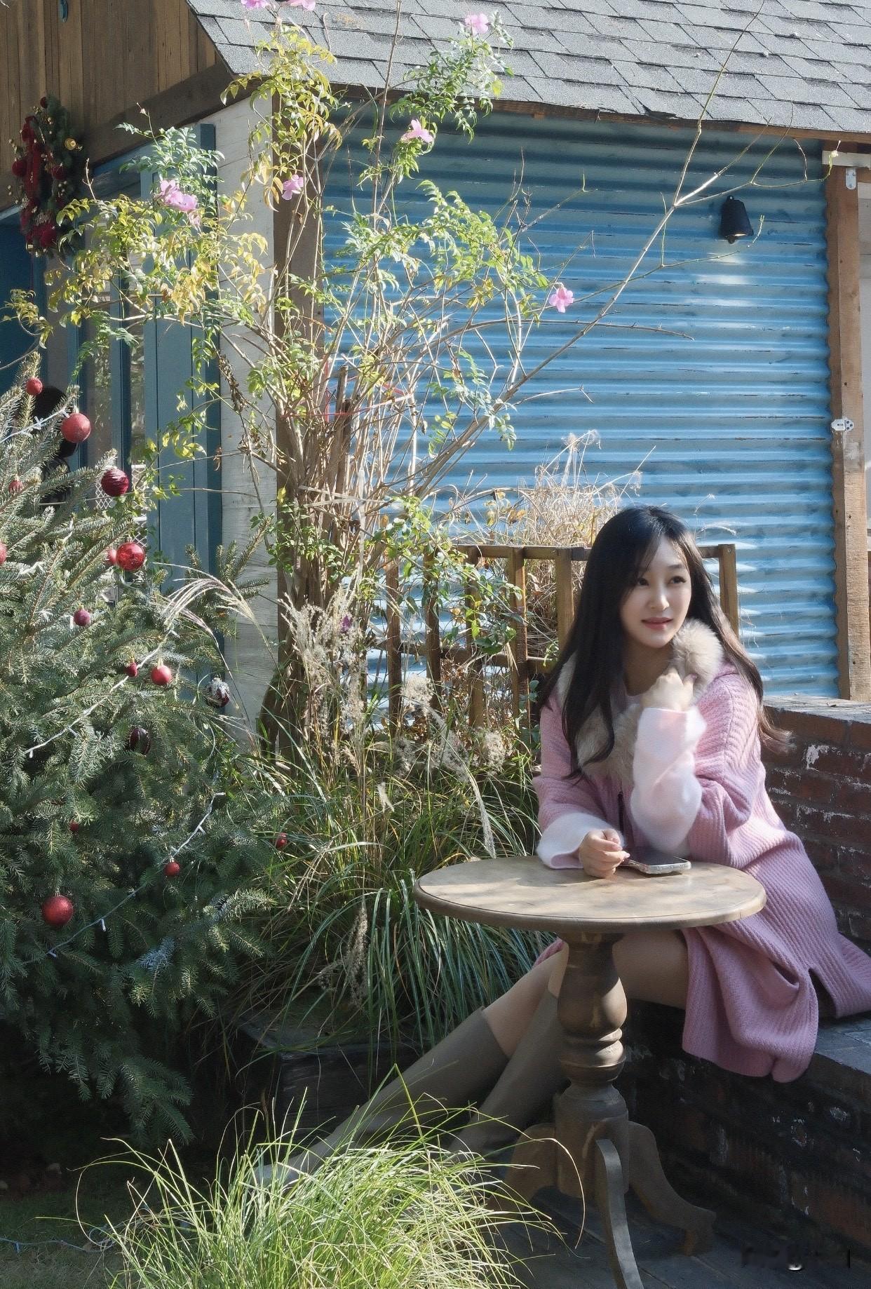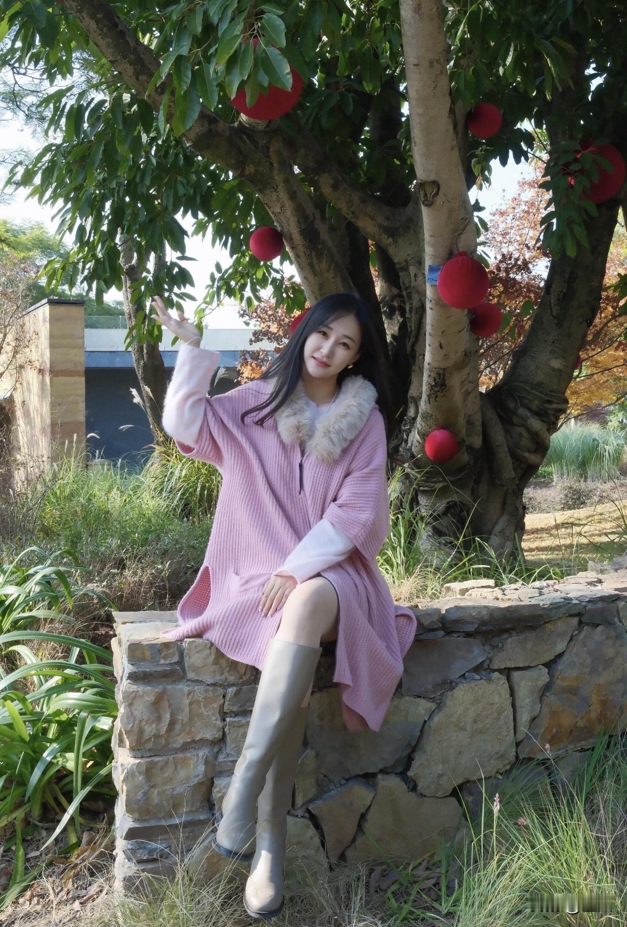 温柔粉色长裙,搭配米色毛衣,清新自然,享受阳光下的美好时光。