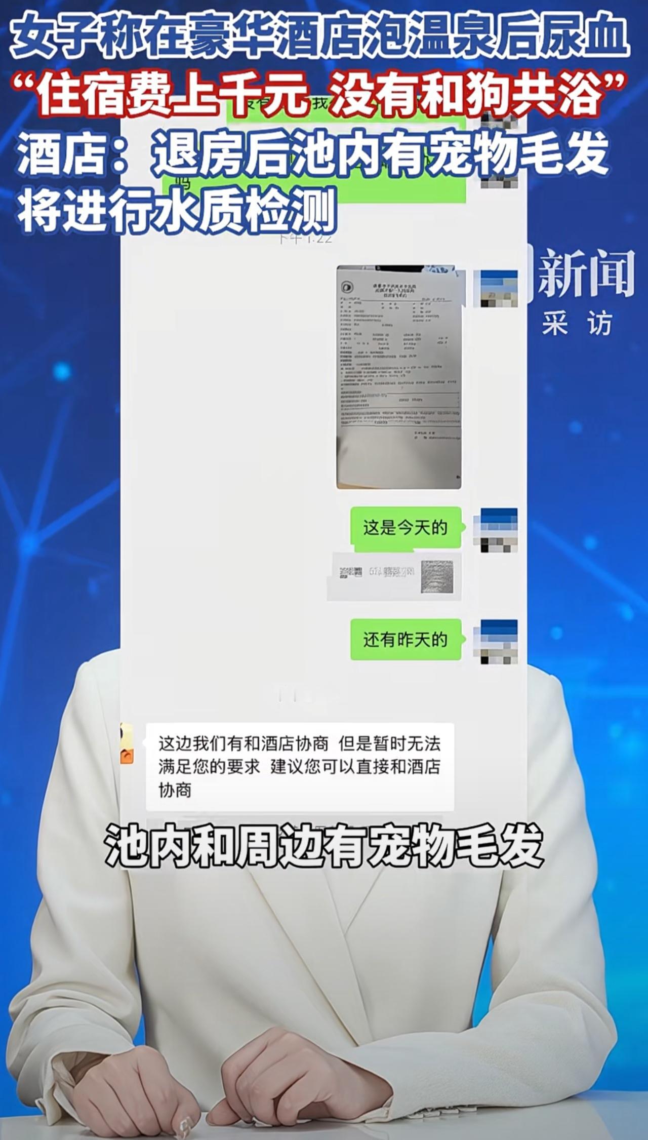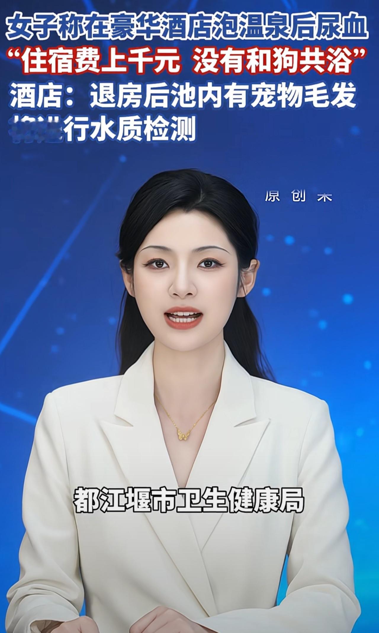 女子称在豪华酒店泡温泉后尿血,被诊断为泌尿道感染。 近日,一女网友发文称,自己在都江堰一家酒店房间内泡的温泉,离店回家后发现尿血,而且房间智能马桶是坏的,坐上去冲水被溅到。自己是带狗一起去住的酒店,但没有和狗一起泡澡。 该女子告诉极目新闻记者,酒店允许携带宠物,住宿费花了上千元。 12月23日,涉事酒店相关负责人表示,将会请第三方公司进行温泉水质检测。 客人退房后打扫时发现室内和周边有宠物毛发。 都江堰市卫生健康局一名工作人员表示,建议客人致电12345反映情况,但需要有证据证明是因泡了温泉尿血的。 狗狗身上可能导致女性尿血的常见细菌主要是大肠埃希菌(大肠杆菌),其次还可能包括葡萄球菌、链球菌等。 这些细菌多存在于狗狗的口腔、皮肤表面及粪便中,女性若与狗狗亲密接触(如抚摸、拥抱后未彻底清洁手部就接触泌尿区域),或接触被狗狗分泌物、排泄物污染的物品,细菌易侵入尿道引发尿路感染。女性尿道短而直的生理特点,使其更易发生上行感染,感染严重时会损伤尿路黏膜,导致黏膜充血、出血,进而出现尿血症状,常伴随尿频、尿急、尿痛等表现。 若出现尿血症状,需立即就医,通过尿常规、尿培养等检查明确病因,遵医嘱使用敏感抗生素(如左氧氟沙星、头孢类药物等)治疗,同时注意清洁卫生,暂时避免与狗狗亲密接触。