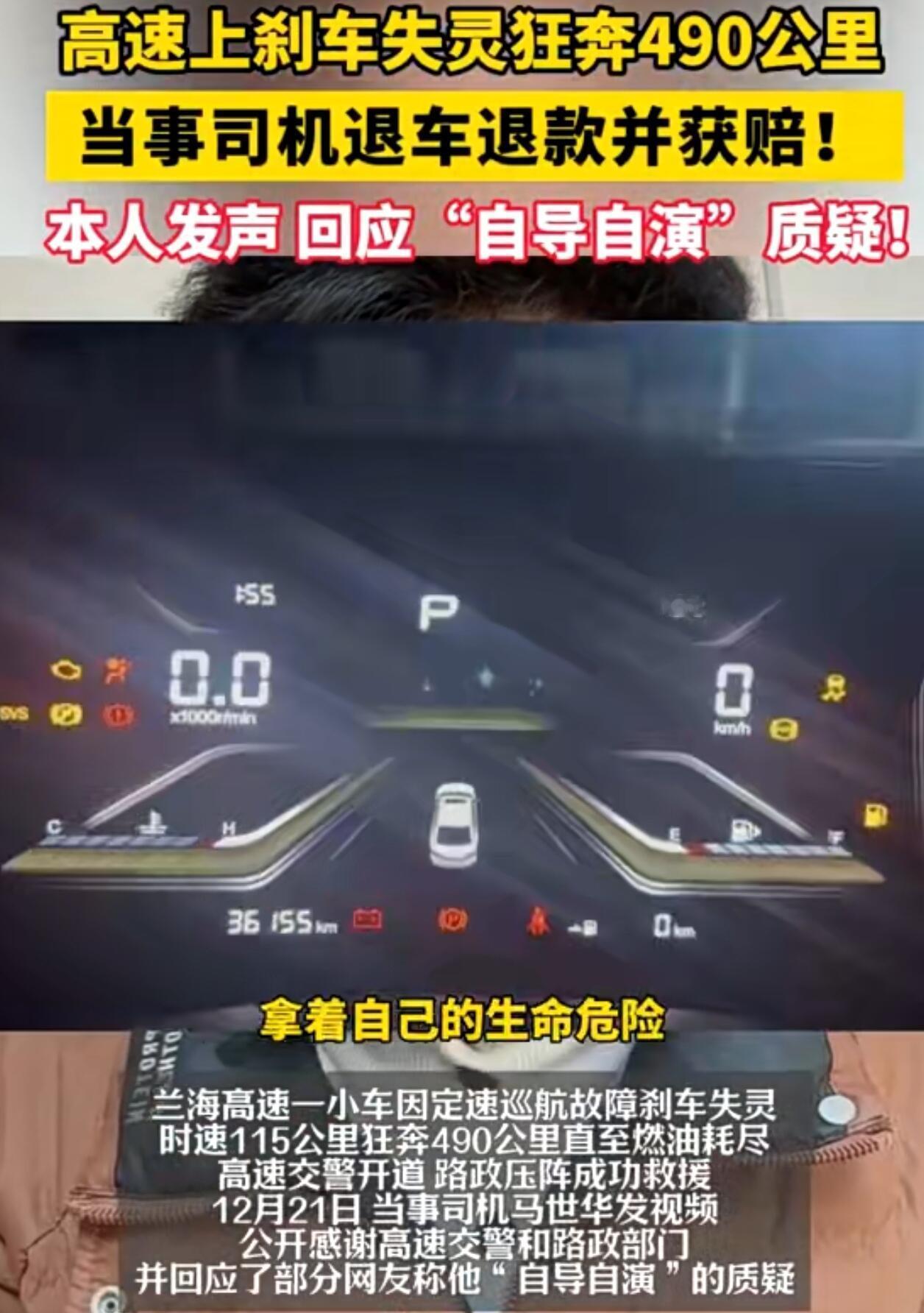 甘肃高速上这事儿可真够吓人的。一辆小车定速巡航坏了,刹车也失灵,顶着115公里的时速跑了快500公里,最后是油烧光了才停下。司机马师傅在里头什么招都试了——踩刹车、挂空挡、拉手刹,全都没用,等于被关在个铁盒子里听天由命。想想都后背发凉。 好在交警反应快,封路、护航,硬是给清出一条道来,没出大事。后来厂家给退了车、赔了钱,但具体赔多少没公开。两边主要在精神损失费上有分歧:马师傅要五万,厂家只愿出两万。 要我说,这事儿重点根本不是赔五千还是五万。关键是车为什么出事?定速巡航和刹车同时失灵,这概率得多低?马师傅坚持要把故障原因写进协议,还保留找第三方鉴定的权利,这太有必要了。车不是玩具,出了问题得有个明白交代,不然谁还敢开? 至于精神赔偿,我觉得经历过这种生死关头的人,要多少钱都不算过分。你想想,那近五百公里路上,每一秒都可能车毁人亡,这种心理阴影可能一辈子都抹不掉。厂家赔钱除了补偿,更是个认错的态度。现在只纠结金额大小,反而把最该关心的安全问题给模糊了。 希望这事儿能给所有车企提个醒:别等出事了再补救,把车做扎实比什么都强。咱老百姓开车上路,图的是个平安,不是刺激。