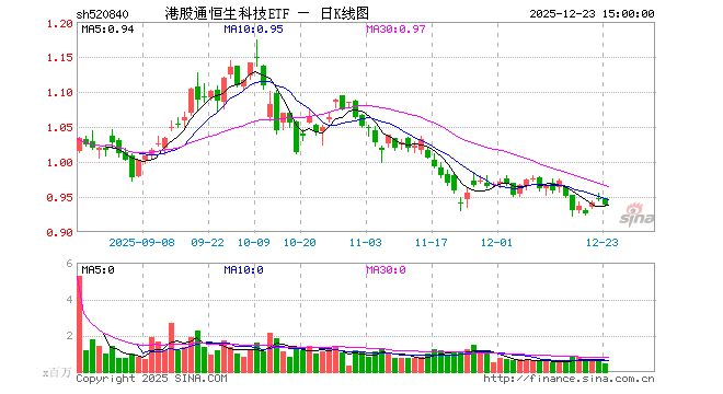 12月23日,港股通恒生科技ETF(520840)跌0.95%,成交额4299.72万元。当日份额增加200.00万份,最新份额为11.53亿份,近20个交易日份额减少1900.00万份。最新资产净值计算值为10.88亿元。