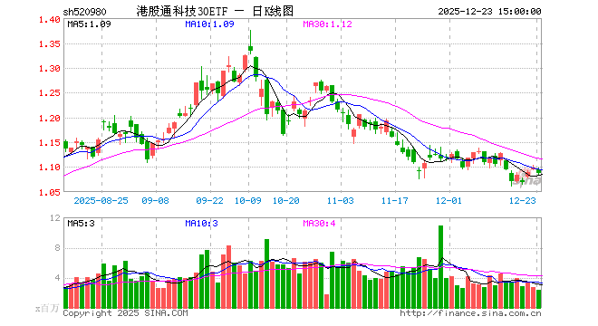 12月23日,港股通科技30ETF(520980)跌1.00%,成交额2.59亿元。当日份额增加7600.00万份,最新份额为44.51亿份,近20个交易日份额增加7400.00万份。最新资产净值计算值为48.60亿元。