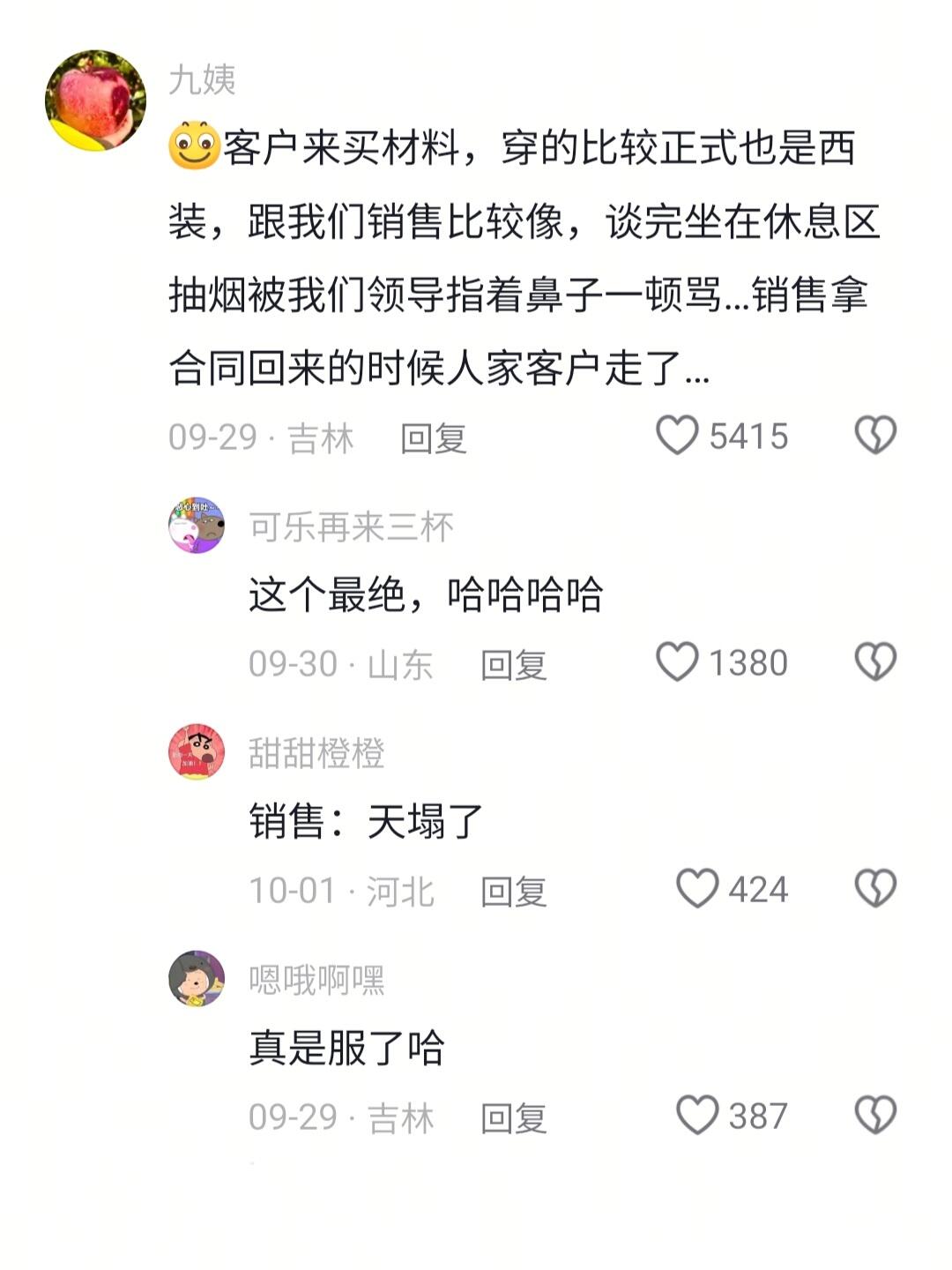 客户来买材料,穿的比较正式也是西装,跟我们销售比较像,谈完坐在休息区抽烟被我们领导指着鼻子一顿骂...销售拿合同回来的时候人家客户走了...