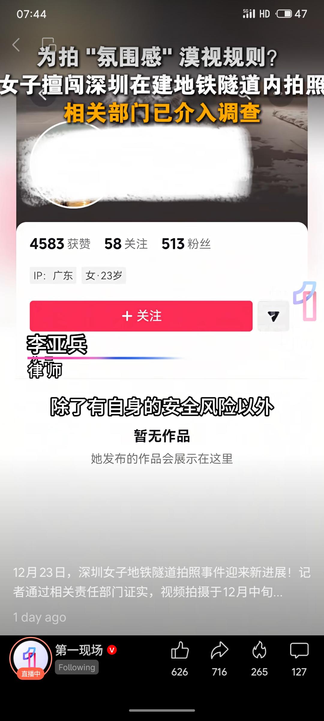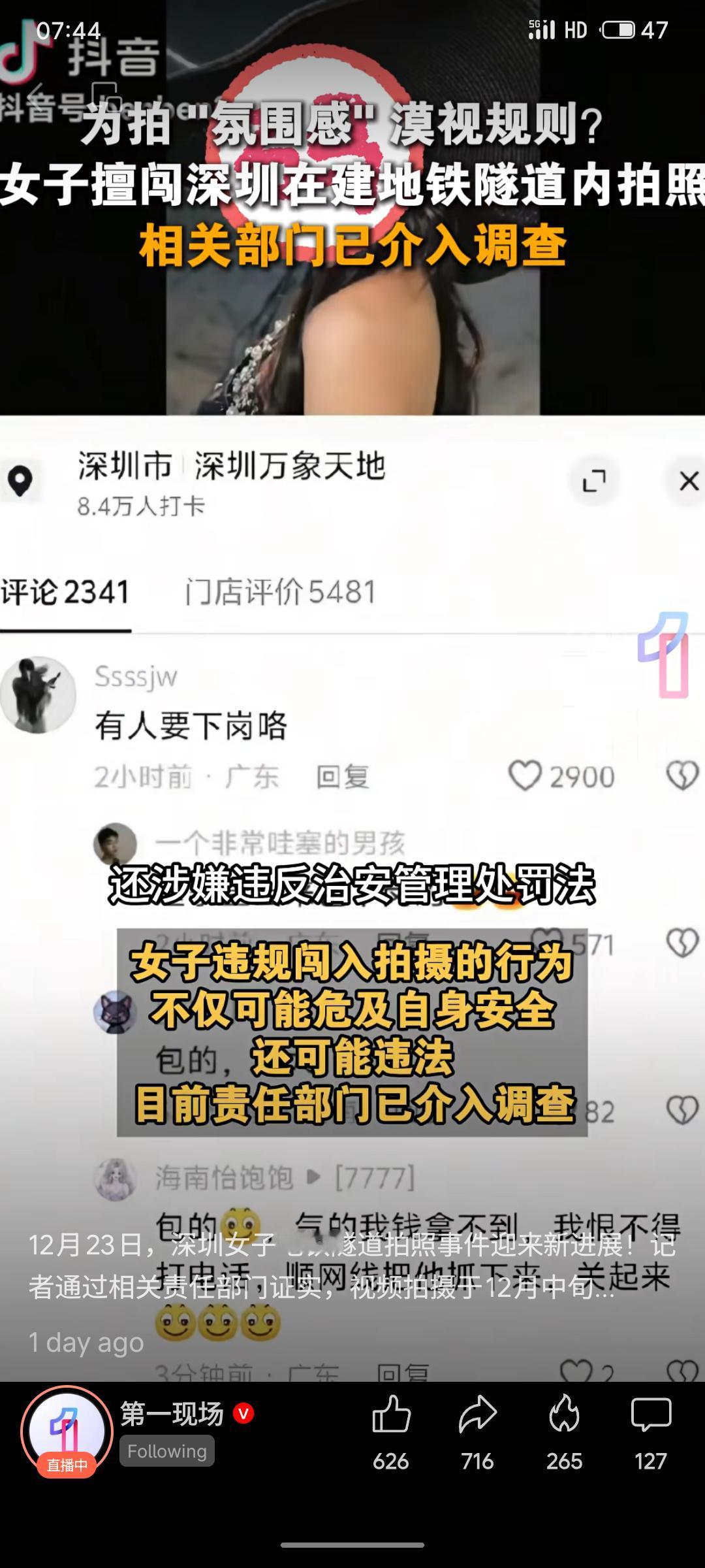 深圳一女子为拍摄“氛围感”照片,擅入在建地铁隧道,引发安全与规则讨论。相关部门已介入调查,其社交账号作品已清空。