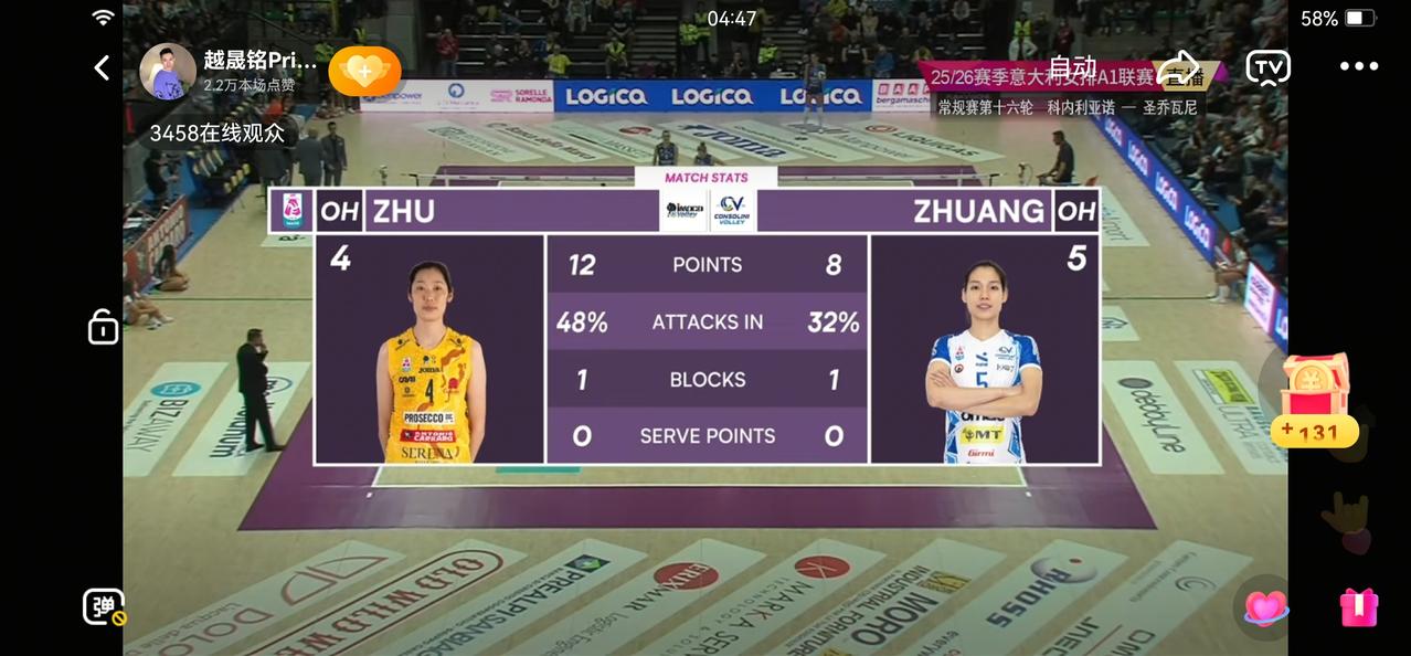 今天凌晨结束的2025-2026赛季意甲女排联赛第十六轮朱婷效力的科内利亚诺比较轻松的以3:0战胜另一名中国球员庄雨珊加盟的圣乔瓦尼,本场比赛,两位中国球员发挥都不错,朱婷打了两局半拿下12分打卡下班并荣获本场MVP,庄雨珊也拿到了10分,意大利转播商也清楚这场比赛受到中国很多球迷关注,也在比赛中给出了两位中国球员的数据,最后的数据是朱婷12分23扣11中,扣球成功率48%;庄宇珊10分27扣9中,扣球成功率33%。从数据上看朱婷的进攻还是占优,最近网上报道中国女排主教练赵勇在内的3人已赴意大利学习和交流,不知道他们今天凌晨到场观看这场比赛没有,如果去了看到朱婷最后获得本场MVP他们又有什么想法?