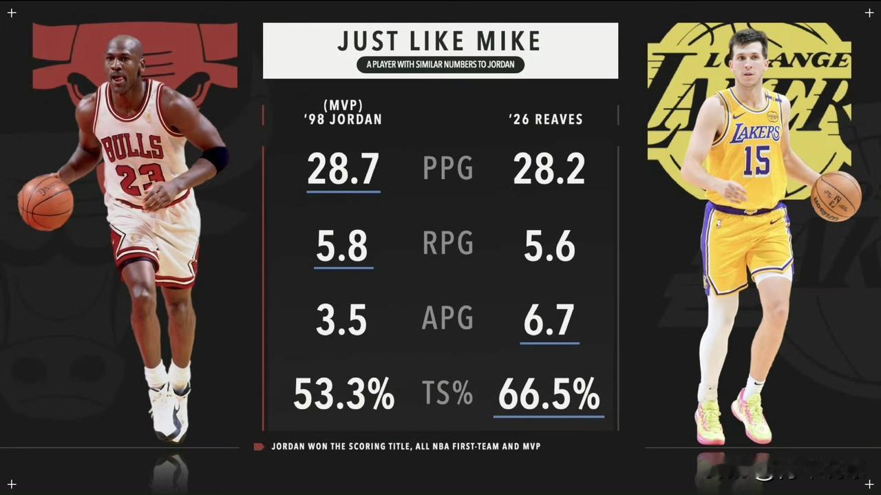 对比乔丹!里弗斯出息了! 今天,湖人队将做客菲尼克斯挑战太阳队,因伤缺席了3场比赛的里弗斯迎来复出。在ESPN的赛前分析环节,里弗斯本赛季的数据被拿来和乔丹获得MVP的1998年赛季数据做比较,主持人真是脑洞大开。 数据显示,里弗斯本赛季场均可以得到28.2分5.6篮板6.7助攻,真实命中率高达66.5%;乔丹场均得到28.7分5.8篮板3.5助攻,真实命中率仅为53.3%。从数据上看,里弗斯似乎更胜一筹。但明眼人都会选择攻防一体、能打硬战的乔丹,他的关键时刻表现、关键战役表现、季后赛表现、防守能力要远远好于现在的里弗斯,这是毋庸置疑的事实。 不过,里弗斯也是好起来了,能拿来和乔丹做比较了。或许这是ESPN为里弗斯拉全明星选票的方式,毕竟后者打出了职业生涯最佳的一个赛季,非常有希望生涯首次入选全明星阵容。