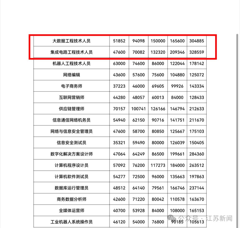 江苏2024工资榜出炉!数字经济行业太能赚,顶尖年薪超53万 江苏2024年工资数据刚公布,数字经济行业直接封神!最赚钱的三个职业全是它家的,人工智能工程师顶尖年薪飙到53万,嵌入式系统、集成电路工程师也超32万。金融行业也不赖,顶尖收入能到31万,电力行业高级技能人才最高也有28万多。 其实现在选行业真得看趋势,数字经济、高端制造这些领域肉眼可见地吃香,不管是选专业还是换工作,跟着高薪资赛道走准没错,普通人也能蹭上行业红利呀!