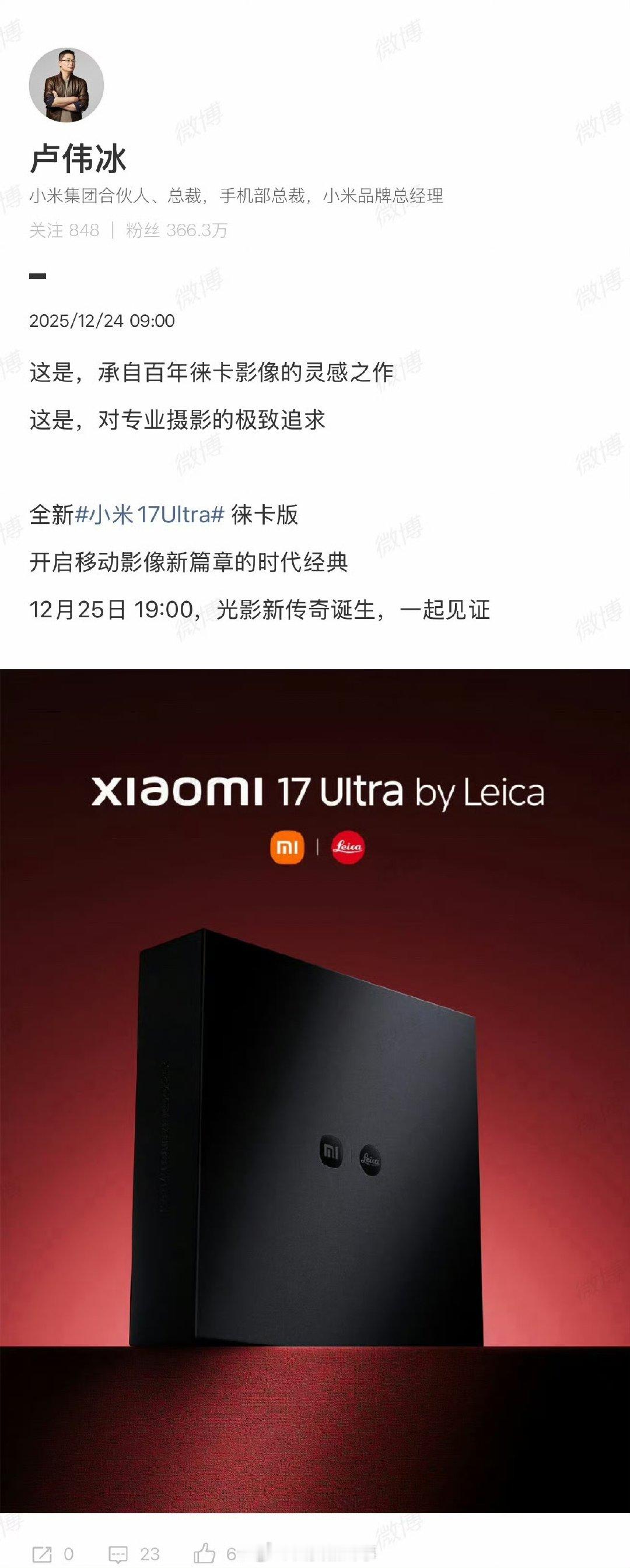【卢伟冰官宣小米17Ultra徕卡版】12月24日,小米高管发文官宣小米17Ul