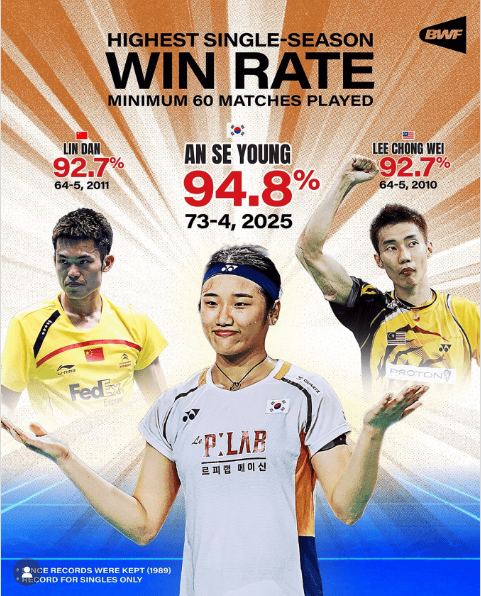 虎扑12月24日讯世界羽联官方更新社媒晒出一项数据:韩国球员安洗莹在2025赛季以94.8%的胜率打破此前林丹和李宗伟创造的单打项目单赛季胜率纪录(1989年有数据记录以来且单赛季至少出战60场比赛)。