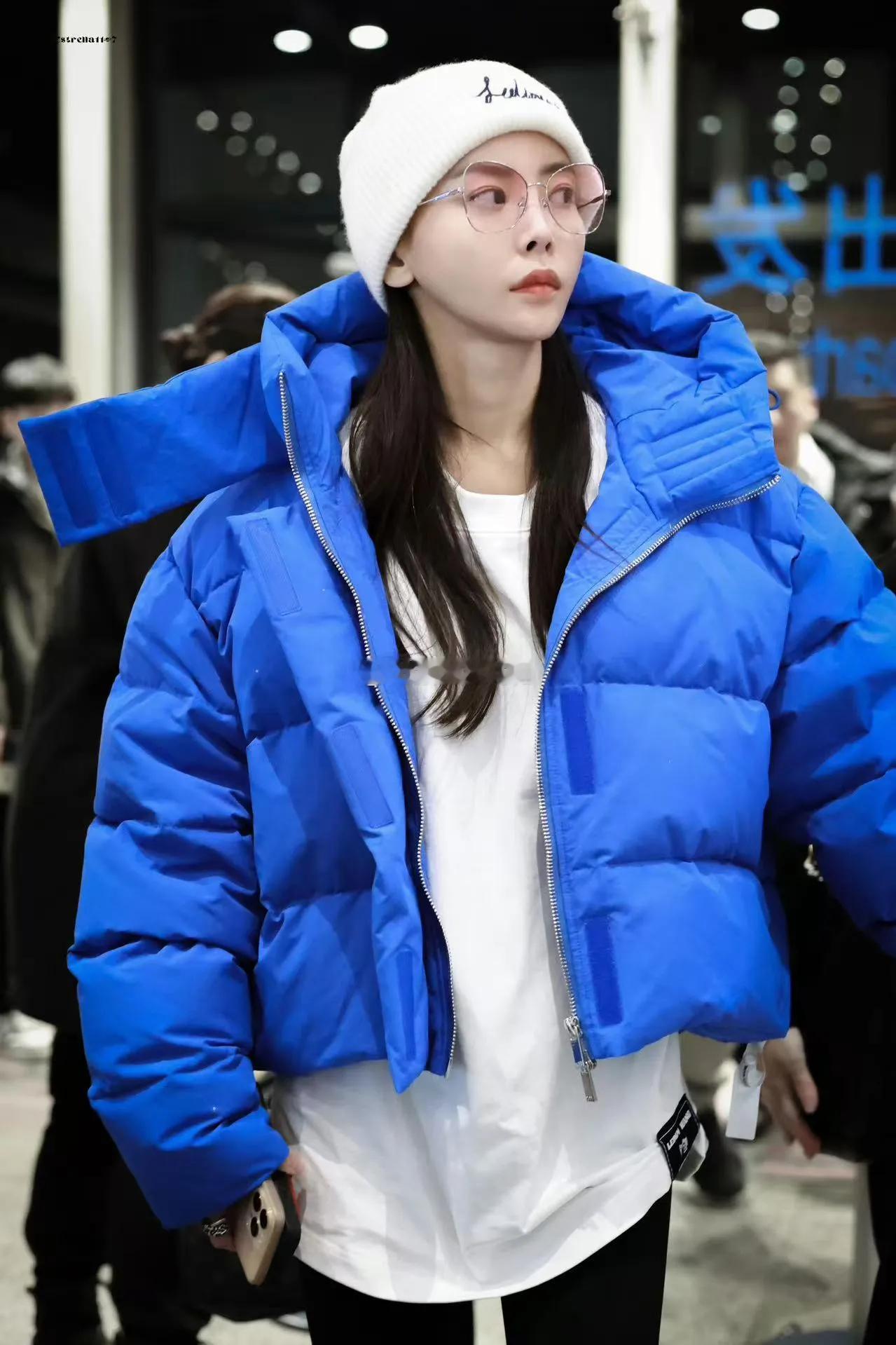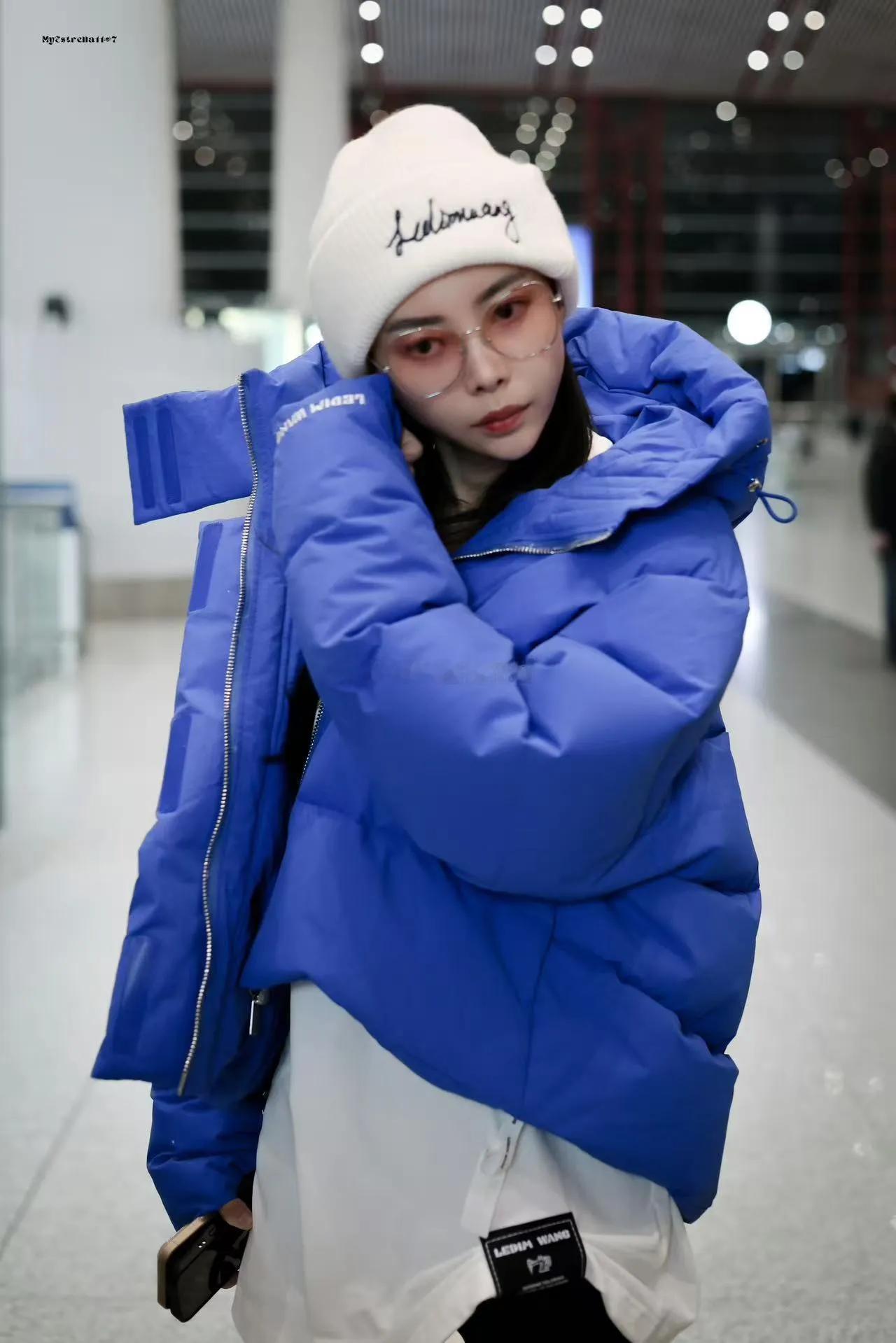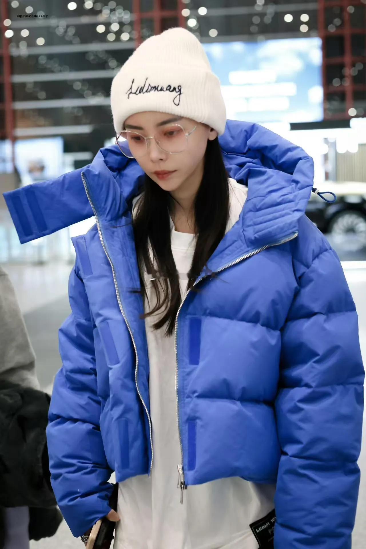 于文文机场私服太可了!蓝色羽绒服配白长T和黑裤子,简约搭配却透着洋气与高级感,时