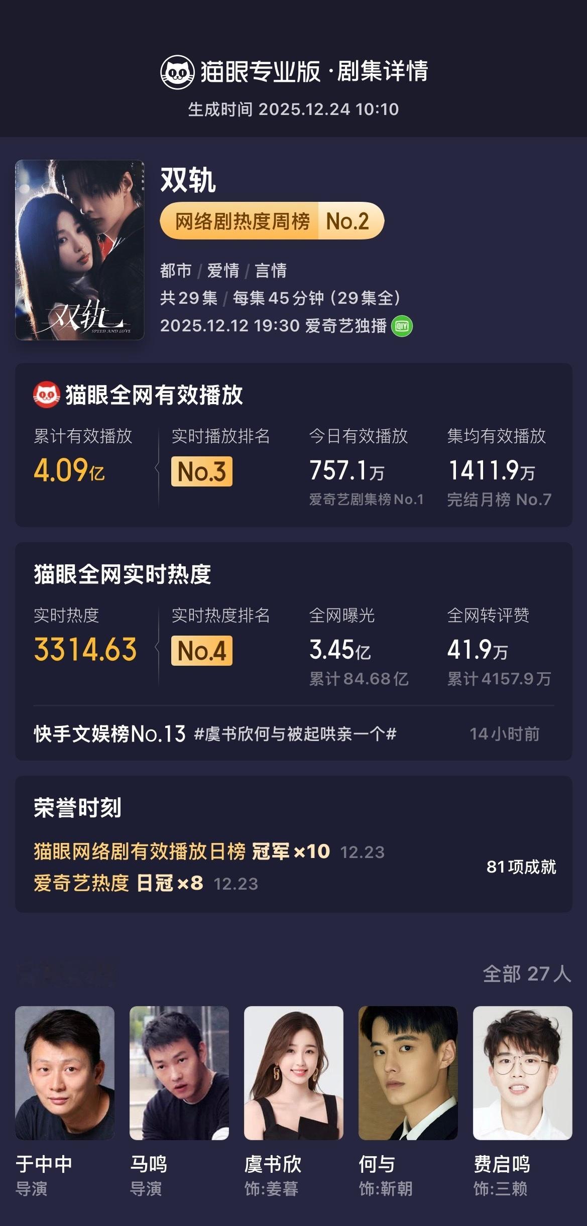 网剧双轨双轨累计10次登顶有效播放榜 据猫眼专业版数据,领衔主演剧集《双轨》已累计10次登顶有效播放榜。截至目前,全网有效播放量已超4.09亿。