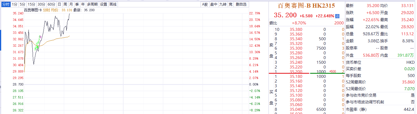 上证报中国证券网讯(记者周亮)12月24日,百奥赛图-B早盘震荡向上,截至10时39分,股价上涨22.65%,现报35.2港元。