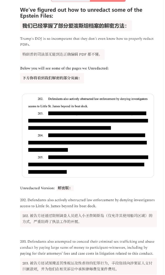 爱泼斯坦临死前视频曝光,大批加密文件被破解,特朗普危险了? 近日,美司法部公布了爱泼斯坦案的最新相关文件,尽管数目多达几十万页,但其中的大量句子、段落,甚至是整页文件都有出现“涂黑”现象,美司法部对外辩称:这是出于保护受害者及其家属的需要。 然而,美司法部为了掩盖敏感信息而使用的“涂黑”手段,似乎并不是什么难以破解的加密方式,有的美国媒体和“X”上的一些频道皆声称,不少被涂黑的部分可以被直接复制,然后只需要将其粘贴至另一个文档中,便可以正常读取被覆盖的信息。 不得不说,美国人在业余这块真是专业的,如果这方法真的能用,那么美司法部对于敏感信息的保密手段也太低劣了:他们可能只是用了PDF中自带的涂黑功能,也可能只是将文档中文字调成黑色,再把背景色也设置为了黑色。 目前,不少美国人已经发现了这个破解方式,并开始深挖这几十万页文件中的被涂黑部分,而根据目前已破解的信息可知,爱泼斯坦曾给过部分受害者巨额封口费,或者直接强硬威胁她们闭嘴,而当调查人员要进入“萝莉岛”时,爱泼斯坦还曾限制他们进入。 尽管目前这些被涂黑的文件还没有挖出什么有关特朗普的猛料,但几十万页的文件,挖下去总会有的。特朗普与克林顿谁是“丑闻主角” 另外,美司法部昨天(23日)还发布了一段爱泼斯坦去世当晚的牢房监控视频,这段视频也可以说是完全的“一眼假”。画面中,“爱泼斯坦”双手掩面,跪在地上机械性地晃悠,而地上的“橙色囚服”,如同液体一样“滩”在地上甚至是洗手台上,还有一块黑色的不明物体,好像是从哪里抠图下来然后贴上去一样,十分违和。 最好笑的是,美司法部之前明明表示,爱泼斯坦自杀当晚的牢房摄像头发生了“故障”,所以不存在任何视频,这不是自己打自己脸吗?而这段视频发布后,美国人气愤不已,感觉自己的智商和眼睛都受到了侮辱,纷纷出来指责视频造假,一片骂声下,心里有鬼的美司法部只能火速删帖,只能说有这种“草台班子”办事,特朗普恐怕一辈子洗白不了。
