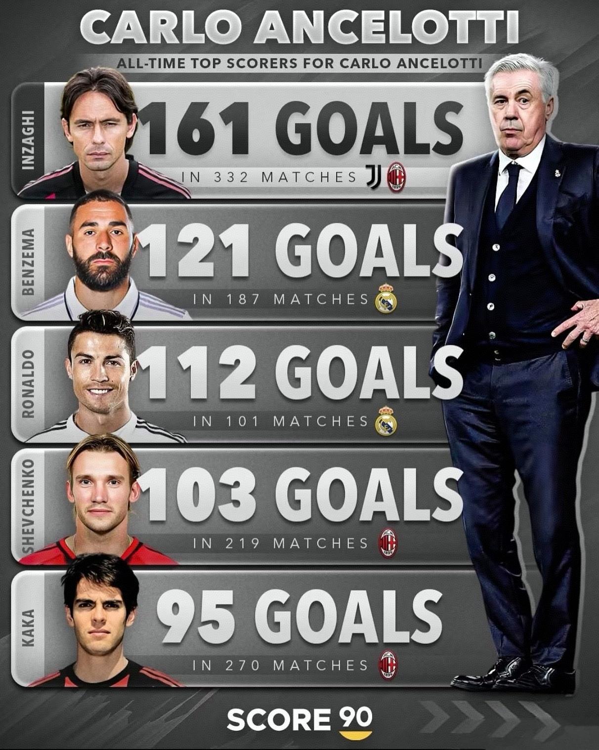 安切洛蒂手下进球最多的球员。 卡卡能进前五真厉害,他是唯一中场,其他都是大名鼎
