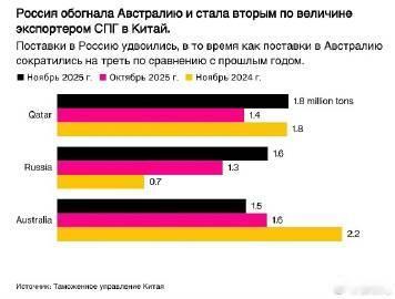 西方对俄制裁失败! 据彭博社消息称: 俄罗斯对华出口天然气达到历史最高水平。 俄罗斯的天然气交货量达到160万吨, 增长超过了一倍,超过了澳大利亚居第二名, 其中第一名是卡塔尔:180万吨! 这表明西方对俄罗斯的制裁彻底失败了!