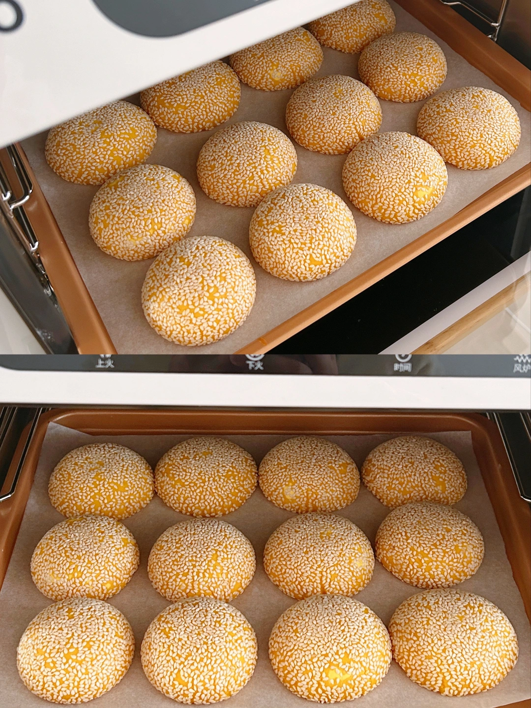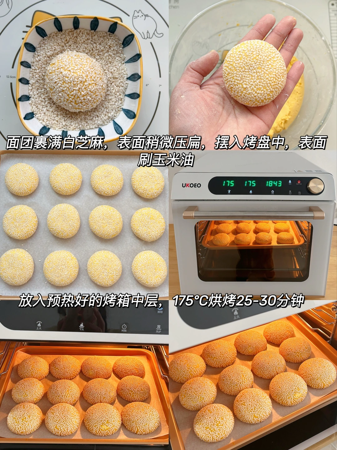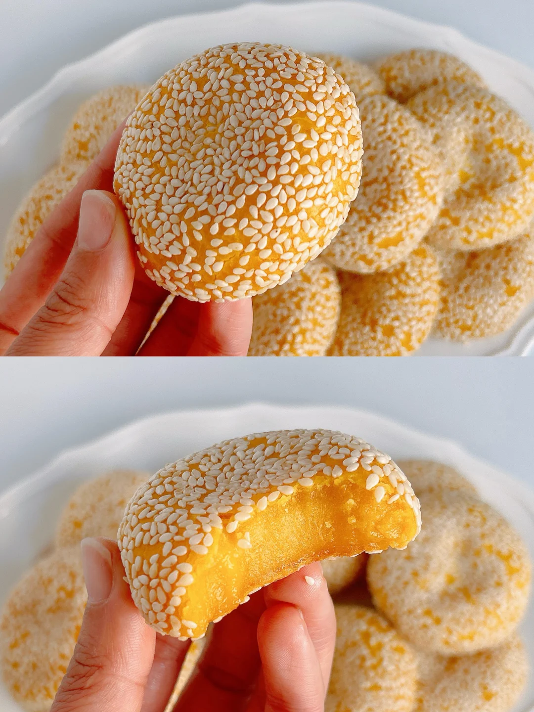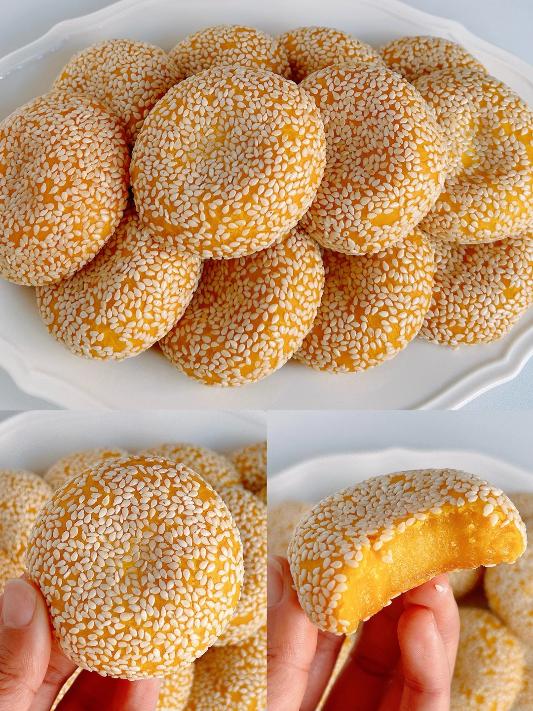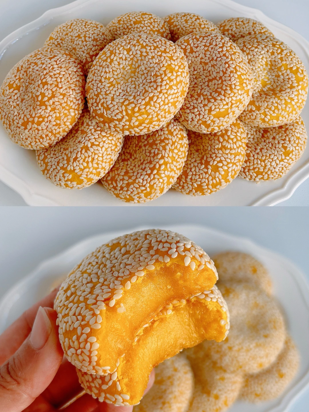家里有吃不完的南瓜,一定要试试这个吃法,超级好的芝麻南瓜饼,外壳考的酥酥脆脆的,一口下去糯叽叽的,香甜香甜的,巨好吃!做法也是简单完全没有难度,免油炸,只需要南瓜、糯米粉,白砂糖三种食材就能做,一起来试试吧! 👉食材准备:去皮南瓜500克,白糖45克,糯米粉400克(南瓜含水量不同,糯米粉酌情增减) 做法: 1️⃣、南瓜去皮切块蒸熟(煮熟的南瓜滤掉多余水分),晾凉后加入白糖压成泥,少量多次加入糯米粉揉成不粘手的面团 2️⃣、取60克左右一个的小剂子,揉圆裹满芝麻,表面稍微按扁,摆入烤盘中,表面刷一层玉米油,防止干裂炸开 3️⃣、放入预热好的烤箱中层,175℃烘烤25-30分钟左右即可 烤好的芝麻南瓜饼,外酥里糯,一口下去糯叽叽的,香甜香甜的,比油炸的还好吃,大人小孩都爱吃!