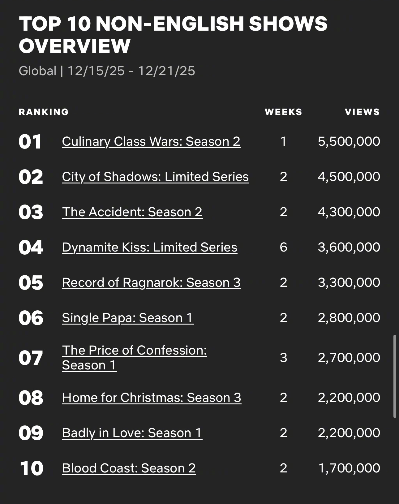 12/15~12/21 Netflix非英语区电视播放量Top10入榜韩剧4一吻爆炸 3.6M,第6周7认罪之罪 2.7M,第3周