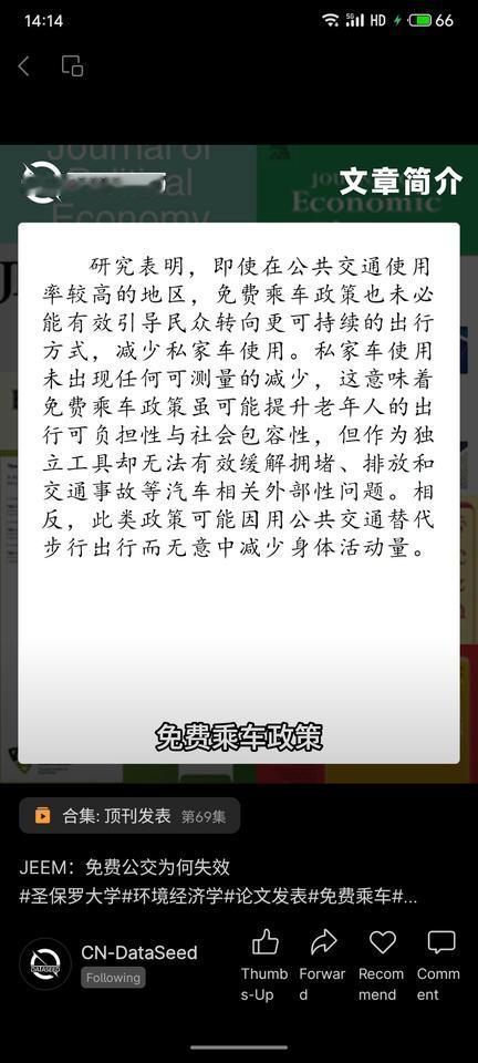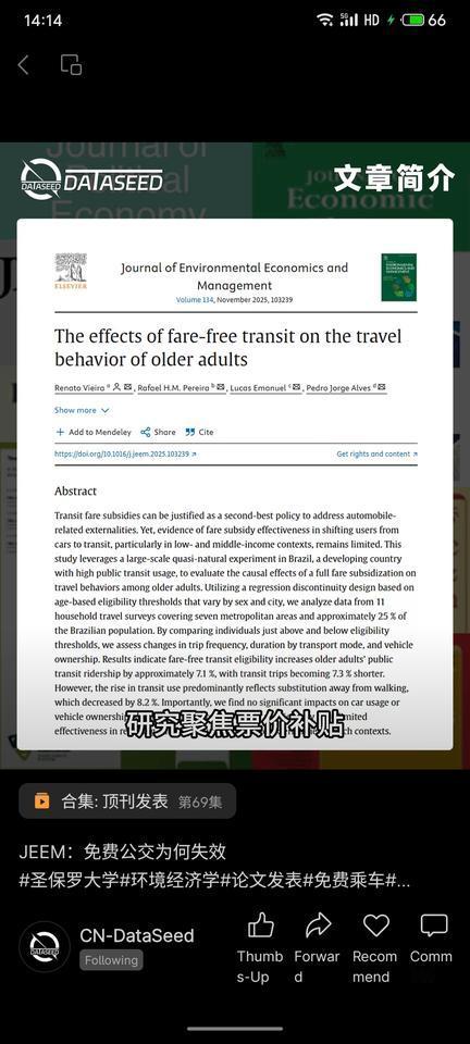 巴西研究发现,免费公交政策虽使老年人公交使用率提升7.1%,但主要替代了步行(减少8.2%),并未显著减少私家车使用或拥有量。这表明该政策虽有助于社会包容,却难以作为独立措施缓解交通拥堵与污染,甚至可能降低身体活动水平。