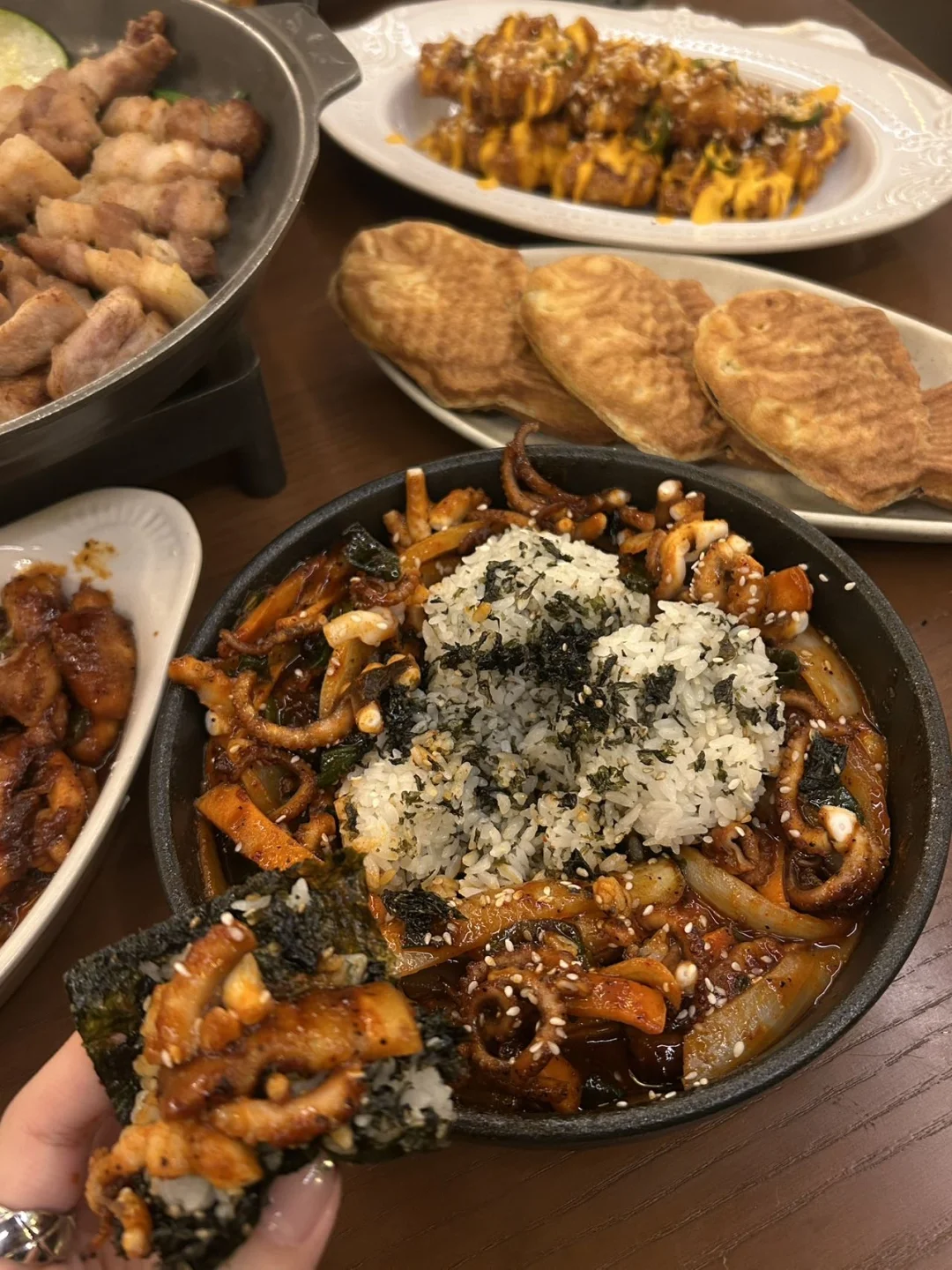 酱汁炒鸡肉裹着浓郁的韩式酱汁,鸡肉炒得很入味,里面还搭配了洋葱等配菜,吸饱了酱汁的配菜和鸡肉一起吃,口感层次更丰富