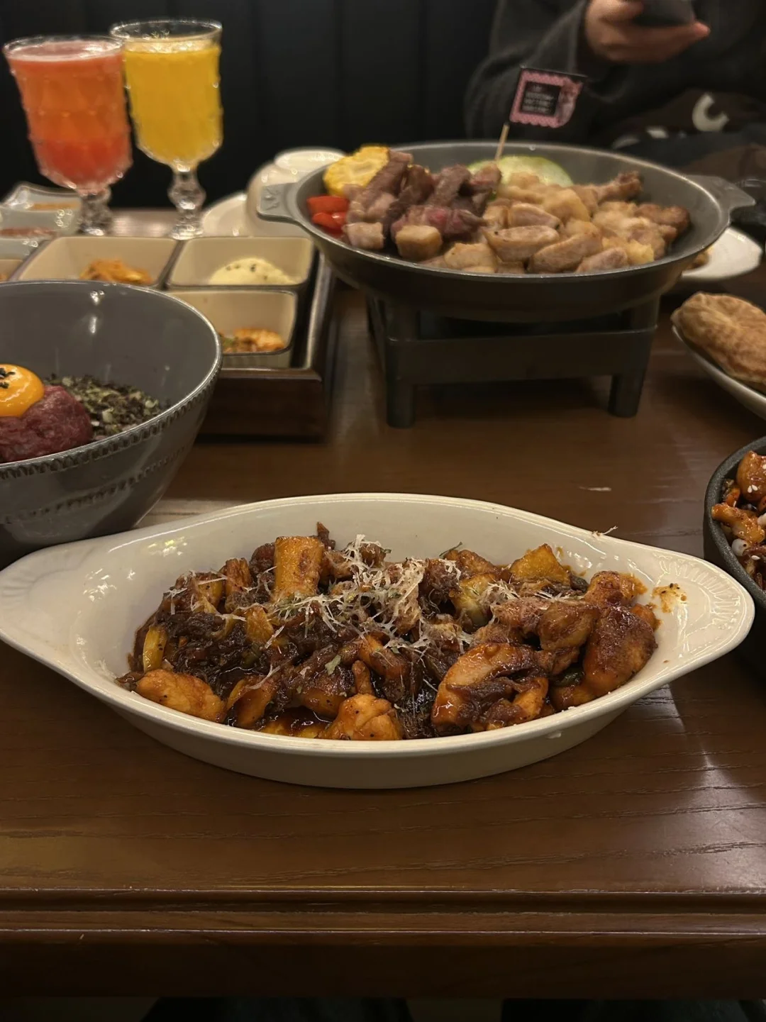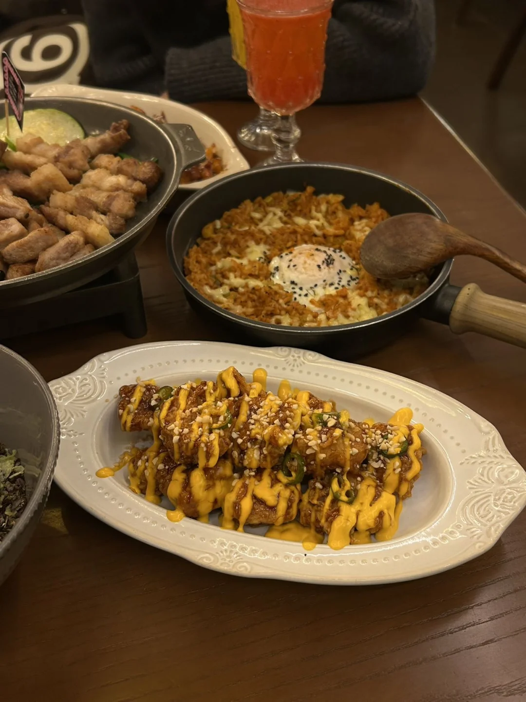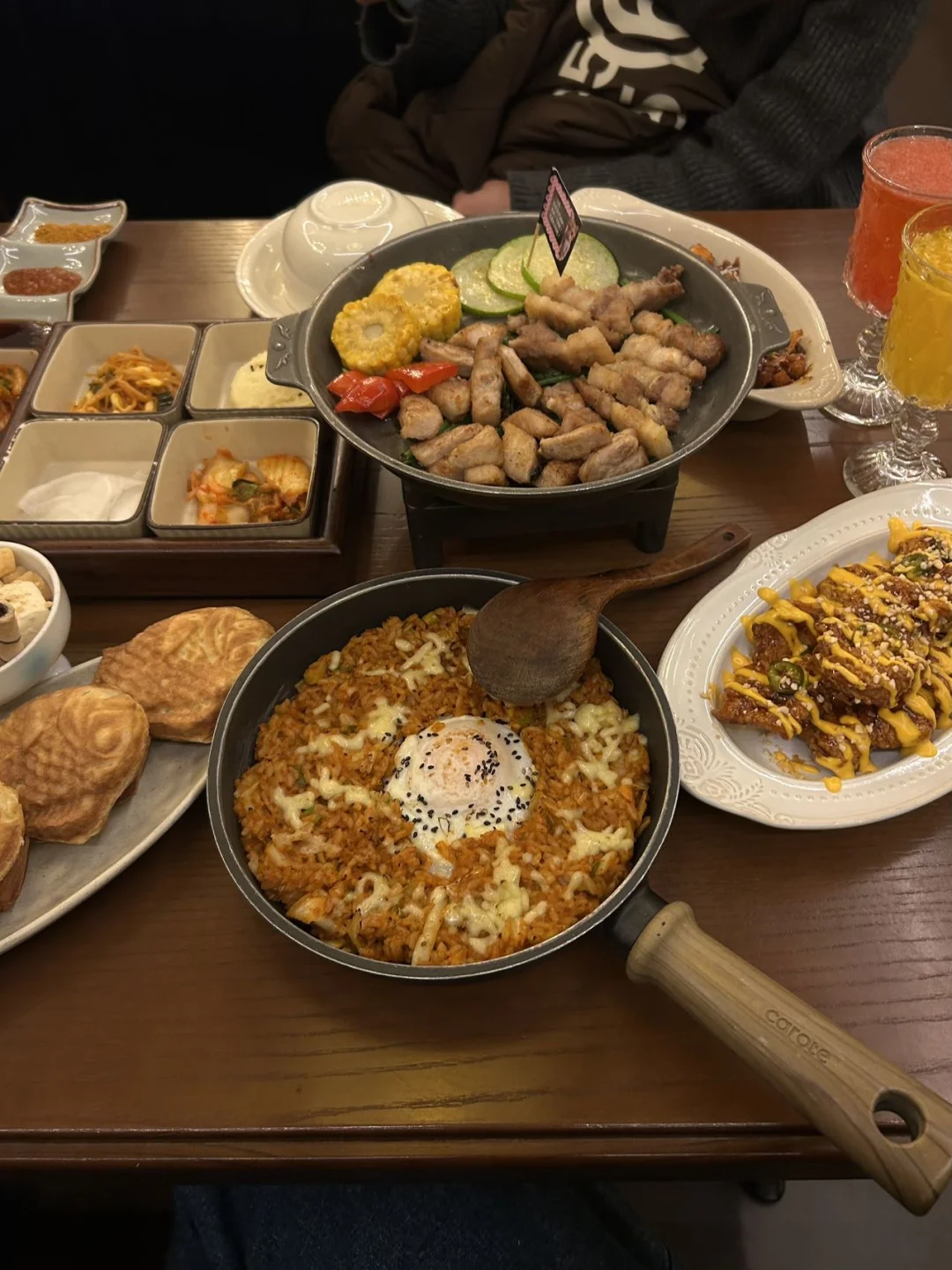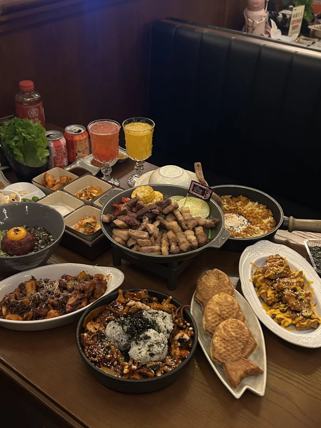 烤盘烤肉选了肥瘦相间的部位,火候把控得刚好,肉质嫩而不柴。裹上生菜,再蘸点韩式酱料,简单的搭配却吃着特别香。