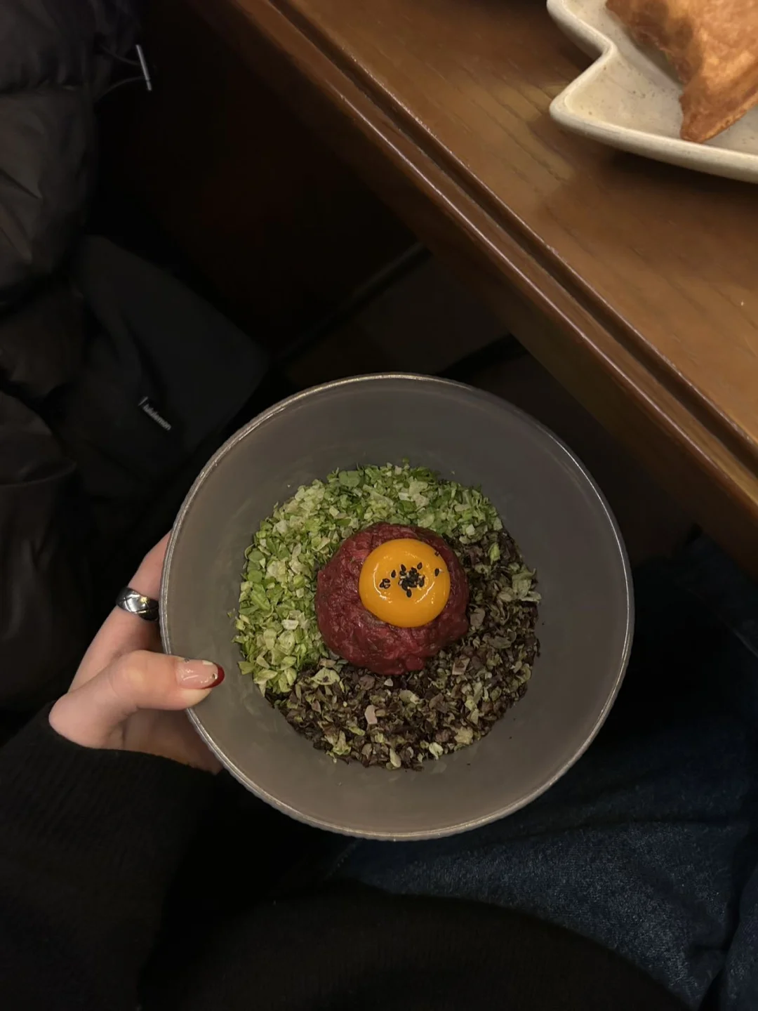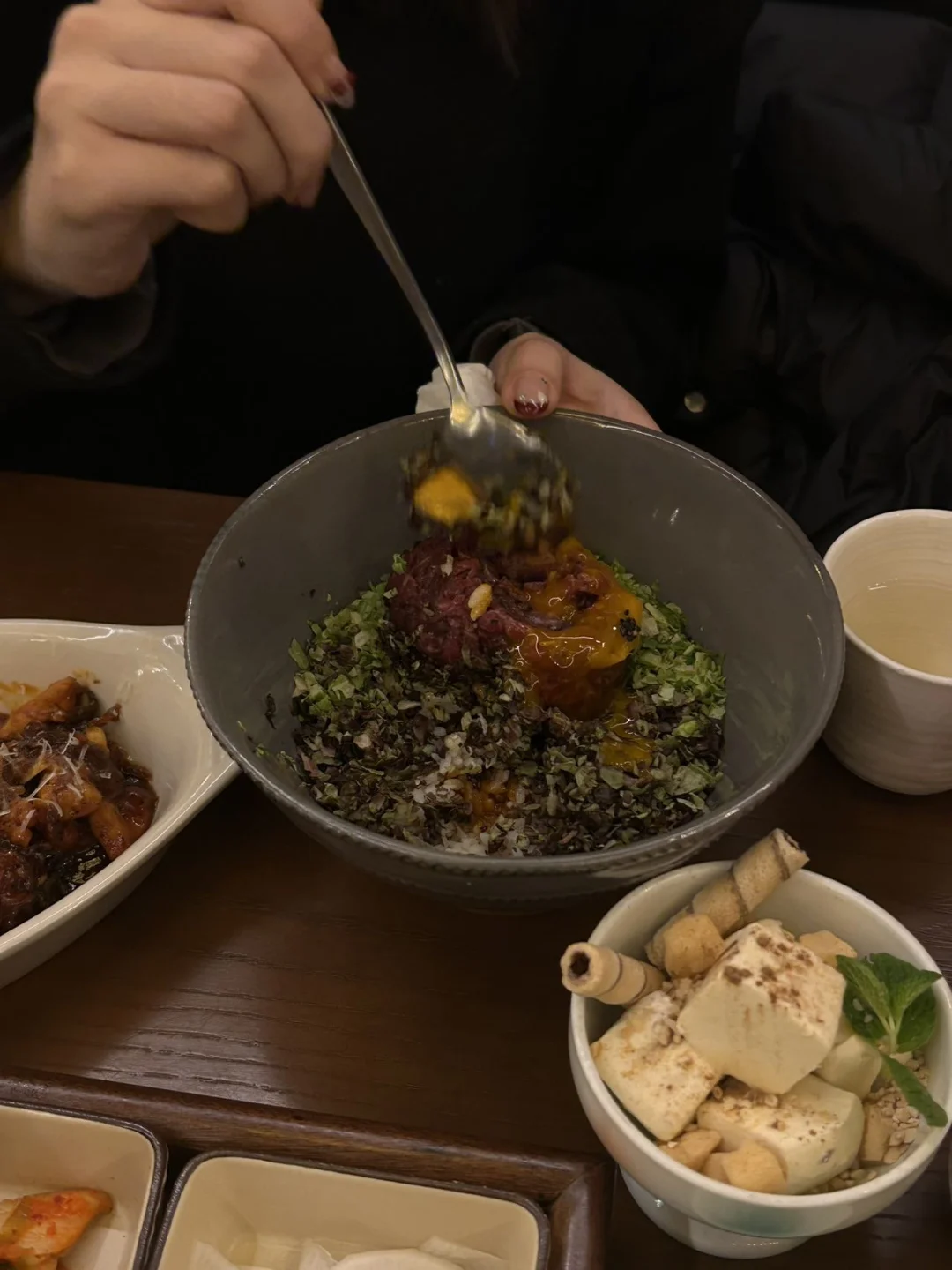 生拌牛肉拌饭颜值和口感都很在线,拌匀后牛肉的软嫩混着蔬菜的清爽,还有蛋黄带来的绵密感