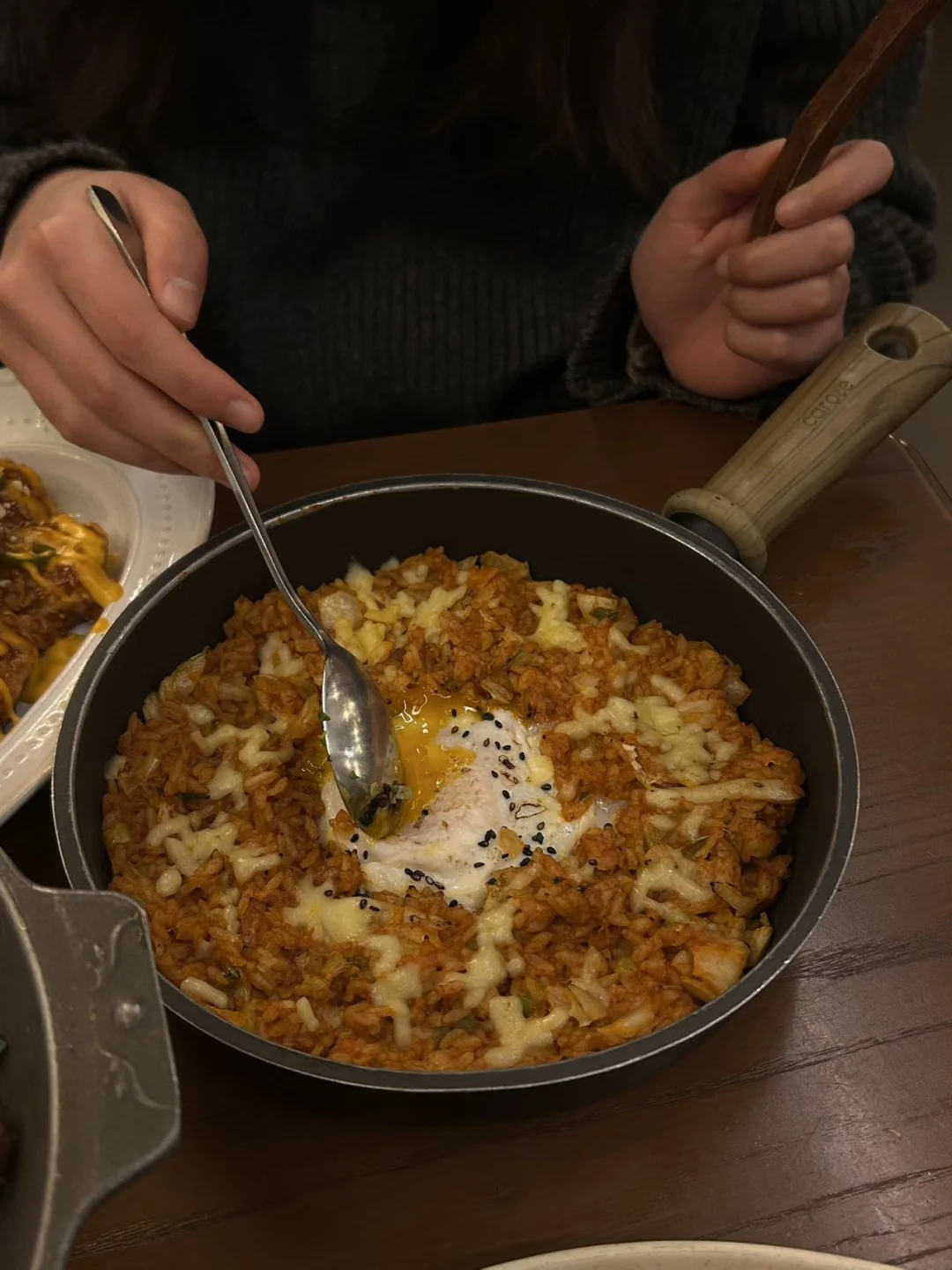芝士流心蛋炒饭 中间的流心蛋戳破后,蛋液和芝士、炒饭拌在一起,米粒吸满了酱汁,芝士的奶香中和了酱料的咸香,口感不腻,吃着很顺口。
