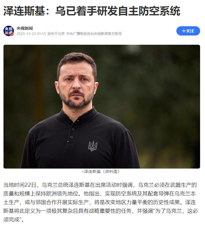 乌克兰最新消息 12月23日,乌克兰总统泽连斯基在公开讲话里宣布:乌克兰已经动手研发自己的防空系统,而且“取得了实质性突破”,他说这是能改变地区力量平衡的历史级任务,必须完成。 了解俄乌冲突的人都清楚,防空一直是乌克兰的重中之重。自2022年冲突爆发以来,俄罗斯的导弹和无人机空袭几乎从未间断,仅2024年11月27日至28日,俄军就从多个方向向乌克兰发射了91枚导弹和97架攻击型无人机,尽管乌军拦截了部分目标,但能源设施、民生建筑仍频繁受损。 长期以来,乌克兰的防空依赖西方援助,美国提供了3套“爱国者”防空系统、12套先进地空导弹系统以及3000多套“毒刺”单兵防空导弹,还有英国的“风暴之影”巡航导弹等装备,这些援助确实撑起了乌克兰的防空骨架,但隐患也始终存在。 西方援助的局限性越来越明显:一方面是供应不稳定,美国国会对援乌资金的分歧、欧洲援助的滞后性,让乌克兰始终面临“弹药告急”的风险;另一方面是使用受限,西方援助的武器往往附加使用规则,无法完全按照乌克兰的战场需求灵活调配。 更关键的是,全球防空武器需求激增导致拦截弹供应紧张,乌克兰急需一套不受制于人的本土防空解决方案。泽连斯基此次宣布的“实质性突破”,正是在这样的背景下应运而生,既是无奈之举,也是主动求变的战略选择。 可能有人会疑问,乌克兰凭什么能在防空系统研发上取得突破?要知道,战前乌克兰的军工体系基本停留在苏联时代,冲突初期甚至连像样的无人机都依赖进口。但三年战火倒逼出了惊人的创新,乌克兰已经构建起一套“需求推动型”的国防技术生态系统,被英国皇家国际问题研究所的研究员称为“现代作战规则的重新定义者”。 在无人机领域,乌克兰早已实现自给自足,2024年巡航导弹产量较2023年增长了8倍,国产远程无人机能打击俄罗斯境内1000公里的目标,莫斯科、俄军空军基地等都曾遭遇其袭击,这些成果为防空系统研发积累了宝贵的技术经验。 更重要的是,乌克兰并非孤军奋战。欧洲盟友的技术与资金支持成为其军工升级的重要助力,德国莱茵金属公司已在乌克兰建厂,波兰军备集团也在2025年2月与乌国防工业公司签署协议,合作研发新式武器。 英国更是直接同意资助乌克兰生产防空系统和远程武器,法国、德国也参与到联合生产中。此外,乌克兰与立陶宛、波兰等北约东翼国家保持着密切的军工合作,这些国家为了自身安全,愿意与乌克兰共享技术、共建生产线,形成了互利共赢的军工合作网络。 泽连斯基所说的“实质性突破”,很可能就是基于这种合作,在空域监控、低成本拦截技术等方面取得了关键进展,比如开发兼容本土导弹的专有发射器,或是针对俄军“Oreshnik”弹道导弹的专用拦截平台。 不过,我们也得清醒看到,研发自主防空系统绝非易事,泽连斯基本人也承认“成熟的防空体系不可能一蹴而就”。乌克兰面临的挑战依然严峻:首先是军工基础设施受损严重,俄军多次精准打击乌军工企业,2024年底苏梅州的绍斯特卡兵工厂、第聂伯罗彼得罗夫斯克的南方机械制造厂先后遭导弹袭击,后者作为苏联时代就存在的导弹生产基地,承担着“海王星”反舰导弹的生产任务,其生产线受损对防空导弹研发影响不小。 其次是核心技术瓶颈,防空系统所需的精密芯片、先进雷达组件等,乌克兰仍依赖进口,短期内难以实现完全自主化。最后是资金压力,尽管有欧洲盟友资助,但研发、测试、量产全程需要巨额投入,对经济濒临崩溃的乌克兰来说,无疑是沉重负担。 从地区局势来看,乌克兰自主防空系统若能顺利量产,确实可能改变当前的力量平衡。目前乌军的防空主要依赖西方装备,覆盖范围和持续作战能力有限,而国产防空系统能快速补充拦截弹库存,且使用不受限制,可根据战场需求灵活部署,尤其能针对性应对俄军频繁使用的自杀式无人机和短程弹道导弹。 更长远来看,这将推动乌克兰军工彻底摆脱苏联遗产的束缚,完全转向北约标准,与欧洲军工体系深度融合,届时乌克兰不仅能实现防空自主,还可能成为欧洲重要的军事装备生产国,这也是泽连斯基将其定义为“历史级任务”的核心原因。 当然,短期内乌克兰仍离不开西方援助,泽连斯基也明确表示,在推进自主研发的同时,会继续落实与合作伙伴的协议,确保防空系统持续引进与部署。当前俄乌冲突已进入僵持阶段,双方都在军工领域加码,俄罗斯不断测试“榛树”新型中程弹道导弹,乌克兰则加速自主武器研发,这场“军备竞赛”或将决定未来战局走向。 对于乌克兰来说,自主防空系统的研发之路注定充满坎坷,但一旦成功,将为其在冲突中争取更多主动权,甚至影响整个东欧的安全格局。我们不妨持续关注,看看这场被寄予厚望的“历史性突破”,能否真正成为乌克兰防务自主的转折点。