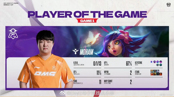 直播吧12月24日讯今日德玛西亚杯比赛上,OMG首局击败LNG,赛后本场辅助Moham凭借出色的表现拿到本场比赛的MVP!