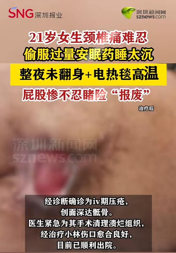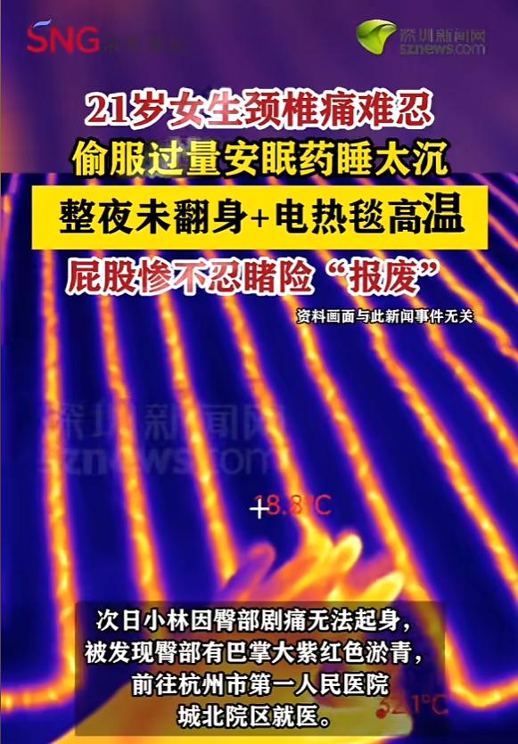 “悲剧还是发生了!”浙江杭州,一女子开着电热毯睡觉,因服用过量安眠药,所以睡得很沉,整晚都没翻身,结果次日一早醒来,她的屁股传来剧烈疼痛,根本无法起身,最后去医院诊治,医生说女子竟然得了压疮,并且组织开始溃烂! 杭州市第一人民医院城北院区的诊室里,21岁的小林被推进检查室时,连简单的侧身动作都做不了。 她的骶尾部顶着一块深紫色的淤斑,边缘已经开始肿胀发烫,轻轻触碰就会引发剧烈疼痛,这看似普通的“压痕”,实则是已经深达骶骨的Ⅳ期压疮。 谁也没想到,造成这场严重损伤的,竟是冬夜里用来取暖的电热毯,再加上几片想帮她睡安稳的安眠药。 小林是名休学在家的大学生,困扰她许久的颈椎问题,到了冬天就变得格外难缠。 冷空气像是往骨头缝里钻,酸痛感整夜盘旋,让她连续好几个星期都没能睡上一场完整的觉。 某个夜晚,实在疼得睡不着的小林,找出安眠药,没多想就多服了几片,又把电热毯铺好开到最高档,希望能睡个踏实觉。 药物起效很快,小林迅速陷入沉睡,这一觉睡得毫无知觉,整个夜晚她的身体始终保持着同一个姿势,没有任何翻身的动作。 直到第二天上午十点多,母亲发现小林迟迟没有起床,推门查看时,才发现女儿躺在床上,脸色苍白,神情痛苦。 母亲掀开被子查看,那块巴掌大的深紫色淤斑格外刺眼,按压时小林的身体会疼得不受控制地颤抖。 母女俩一开始以为只是长时间压迫导致的淤血,试着简单揉搓了几下,可没想到淤斑不仅没消退,反而肿得更厉害。 意识到情况不对,母女俩赶紧带着小林赶往医院,接诊的创面修复科副主任医师吴林军,看到小林的症状后,立刻安排了详细检查。 检查结果让母女俩倒吸一口凉气,小林患上的是Ⅳ期压疮,这种程度的压疮通常需要数天甚至数周才会形成,可她的创面已经深达骶骨,皮下组织和肌肉都出现了坏死。 吴医生结合小林的情况,很快理清了损伤快速恶化的原因,核心就是安眠药和电热毯的“双重作用”。 过量的安眠药抑制了她的生理反射,连最基本的翻身本能都消失了,身体长时间压迫同一个部位,局部血液循环彻底停滞,这是压疮形成的基础条件。 而整夜开启的电热毯,持续释放着40多摄氏度的低温热源,这种温度不会让人立刻感到灼热,却会慢慢渗透到皮肤深层,造成隐蔽的低温烫伤。 压力和低温烫伤叠加在一起,相当于给压疮的发展按下了“快进键”,才让原本需要漫长过程形成的重症压疮,在一夜之间就爆发了。 像小林这样的年轻患者并不少见,很多人都有个误区,觉得压疮是老年人的“专属病”,年轻人身体好,肯定不会中招。 可实际上,压疮的本质就是局部组织长期受压导致的细胞坏死,只要满足“持续受压”的条件,不管年龄大小都有可能患病。 尤其是那些长期服用镇静类药物、醉酒后熟睡,或者长时间保持一个姿势工作、打游戏的年轻人,患上压疮的风险一点都不低。 更值得警惕的是电热毯带来的低温烫伤,这种伤害因为隐蔽性强,很容易被忽视,成为冬天里难以发现的小危机。 它和开水烫伤完全不同,不会瞬间起水泡、引发剧痛,初期可能只是轻微的红斑,伴有一点点麻木感,很多人都会误以为是普通压痕或者皮肤干燥,根本不会放在心上。 可等到疼痛感越来越明显,皮肤出现水泡、发黑时,皮下的脂肪、肌肉甚至神经都已经受到了严重损伤,不仅治疗难度大,恢复周期也会明显变长。 如果不小心出现了疑似低温烫伤的症状,首先要立刻脱离热源,然后用15到20摄氏度的冷水持续冲洗,阻止热量继续往皮肤深层渗透。 这里要特别注意,不要用冰块直接冷敷,也不要强行撕扯粘在皮肤上的衣服,更不能自己挑破水泡、涂抹牙膏或者酱油之类的民间偏方,这些做法只会加重损伤,还可能引发感染。 如果皮肤出现水泡、发硬、焦痂,或者创面已经破溃,一定要马上就医,早期干预才能最大程度减少伤害,缩短恢复时间。 万幸的是,小林送医比较及时,经过手术治疗和后续的精心护理,伤口慢慢愈合,最后顺利出了院。 这场意外也给所有年轻人敲响了警钟,冬天取暖不能只图方便和舒服,就忽视了背后隐藏的安全隐患。 不管是使用取暖设备,还是因为身体不适需要长时间休息,都要记得定时活动身体,给局部组织减压、透气。 毕竟,温暖过冬的前提,是守护好自己的健康。