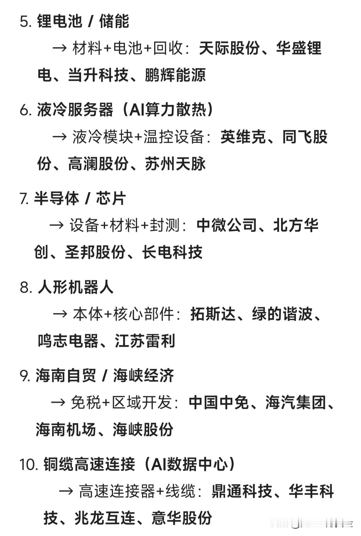 12月24日十大热点概念及产业链龙头梳理 商业航天  → 火箭/卫星制造与发射:中国卫星、航天晨光、神剑股份、国机精工 新能源汽车(含电池)  → 整车+三电系统:比亚迪、赛力斯、宁德时代、亿纬锂能 军工/军民融合  → 航空装备+信息化:中航沈飞、航发动力、中国长城、四创电子 可控核聚变  → 超导+热管理+电源:百利电气、雪人股份、王子新材、宝胜股份 锂电池 / 储能  → 材料+电池+回收:天际股份、华盛锂电、当升科技、鹏辉能源 液冷服务器(AI算力散热)  → 液冷模块+温控设备:英维克、同飞股份、高澜股份、苏州天脉 半导体 / 芯片  → 设备+材料+封测:中微公司、北方华创、圣邦股份、长电科技 人形机器人  → 本体+核心部件:拓斯达、绿的谐波、鸣志电器、江苏雷利 海南自贸 / 海峡经济  → 免税+区域开发:中国中免、海汽集团、海南机场、海峡股份 铜缆高速连接(AI数据中心)  → 高速连接器+线缆:鼎通科技、华丰科技、兆龙互连、意华股份