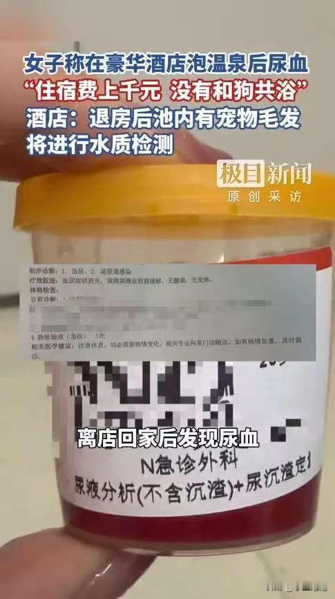 严查到底!近日,四川成都,一女子花费千元,带着狗住进一家豪华酒店,可女子在泡过房间内的温泉后,就开始尿血,去医院被诊断为泌尿道感染!女子否认和狗一起泡澡,酒店却在池内发现了大量狗毛。网友:上个客人留的?花上千块住高端酒店泡出病,这事儿直接让大家质疑豪华酒店的卫生了。 这名女子住的是成都主打私汤温泉的豪华酒店,一天房费上千。泡完温泉没两天尿血,确诊泌尿道感染后,她找酒店维权,说根本没让狗进温泉池,觉得是水质问题。 酒店退房后清理池子,发现不少宠物毛,还和她带的狗毛匹配。酒店说允许带宠物但禁止进温泉区,怀疑是她违规。 网友吵翻了,有人说她不守规矩活该,也有人觉得酒店清洁不到位,就算毛是上一位客人的,也说明卫生差。 今年10月成都另一家温泉酒店就因私汤池清洁不达标被通报,客人泡完都过敏。可见不少高端酒店只顾装修和特色,忽略了卫生安全。 责任方面,她没违规就是酒店的锅,她违规了就自己担责。但酒店允许带宠物却没装监控,退房后也没彻底消毒留记录,这是管理漏洞,不能全怪客人。 酒店现在要检测水质,结果还没出。这事也提醒酒店,带宠物入住得平衡好管理和卫生,定好清洁规矩。 高端酒店卫生安全才是关键,消费者花大钱就该享受到位服务。现在双方还没谈拢责任,那你觉得酒店清洁流程有没有责任?允许带宠物的酒店该怎么定温泉池清洁标准?