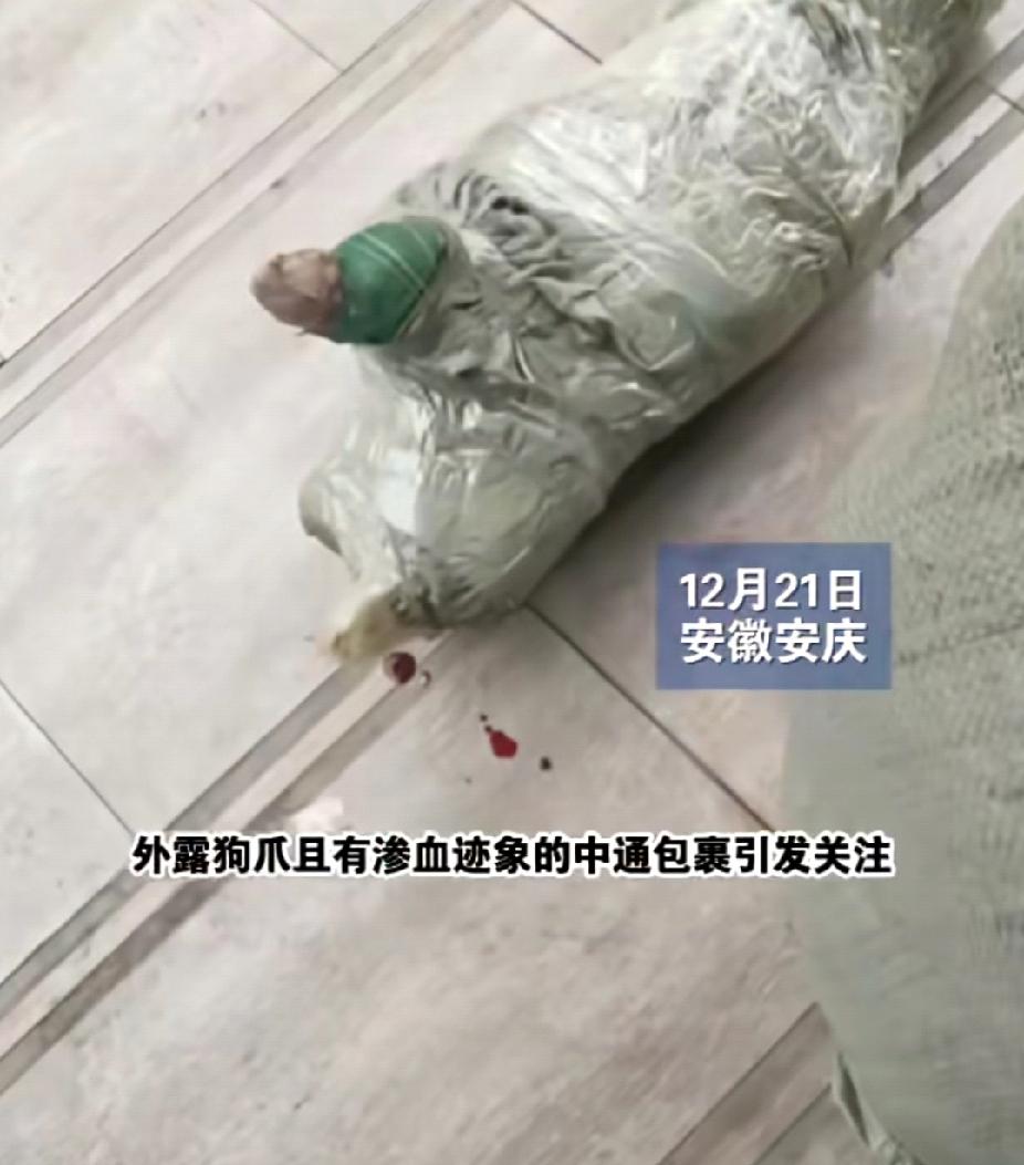 12月21日,安徽安庆一家快递驿站内一个渗着血露着狗爪子的包裹引起了注意,中通回应是“羊蹄”后众人怀疑加剧! 从包裹的外形来看,里面包裹的应该就是一只狗狗。但为什么会有一只爪子露在外面,为什么快递已经到站还依然渗出鲜血?是不是打包的时候狗狗还活着?为什么这么明显的狗爪子,快递公司却回应是羊蹄? 是一场怎样的交易让一只狗狗被打包成这样?而又是怎么通过审查打包的呢? 真的是太残忍了!强烈呼吁国家立法保护!对此,你有什么想说的呢?