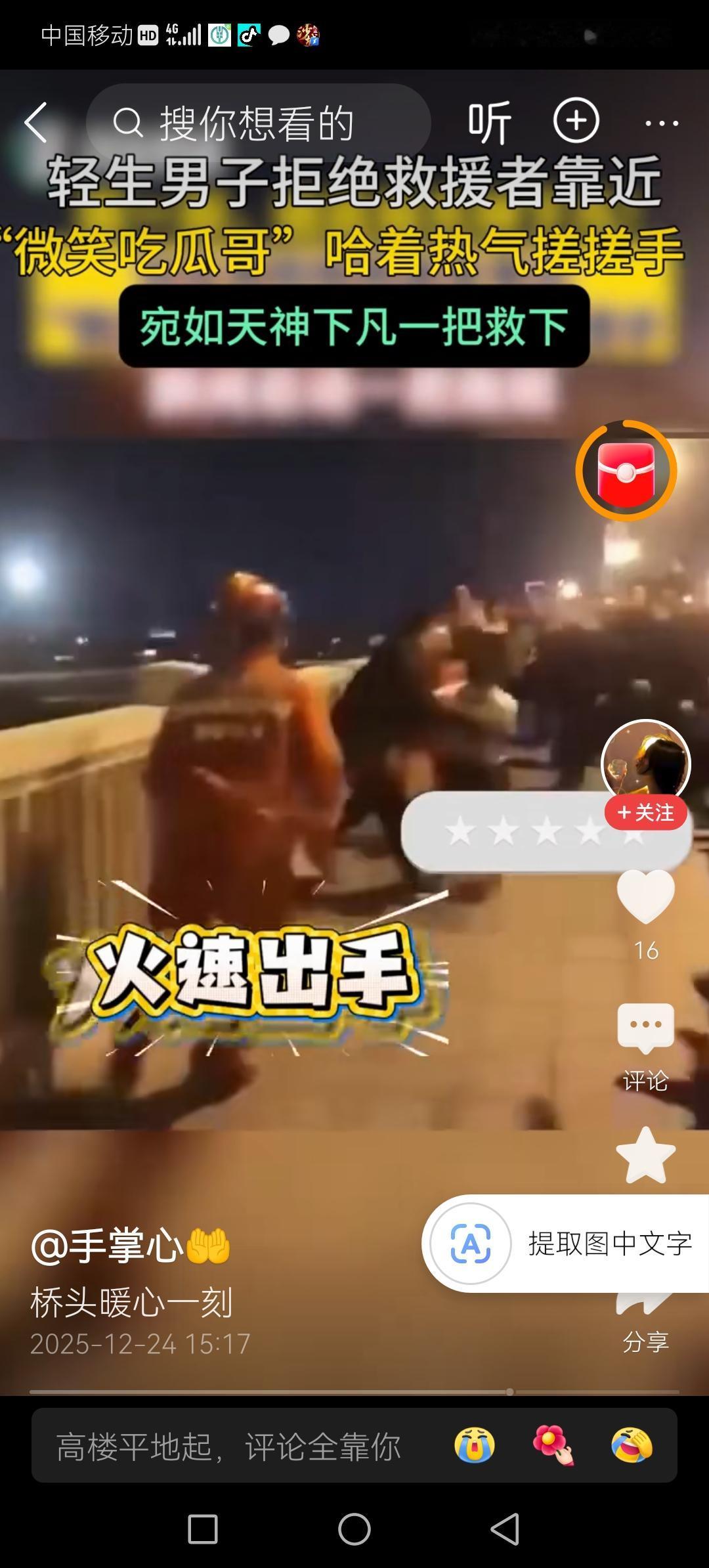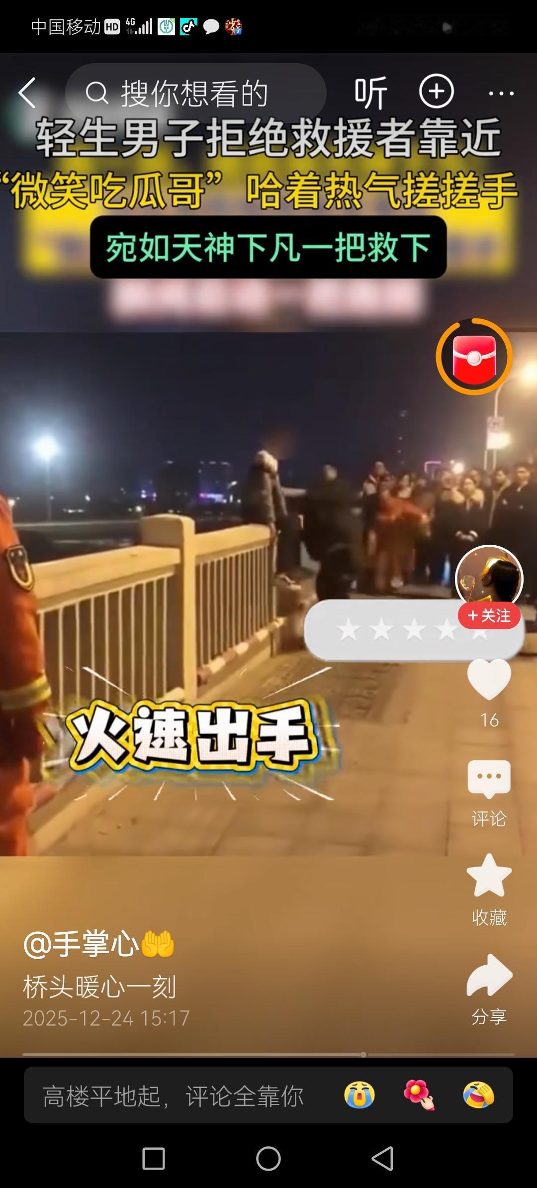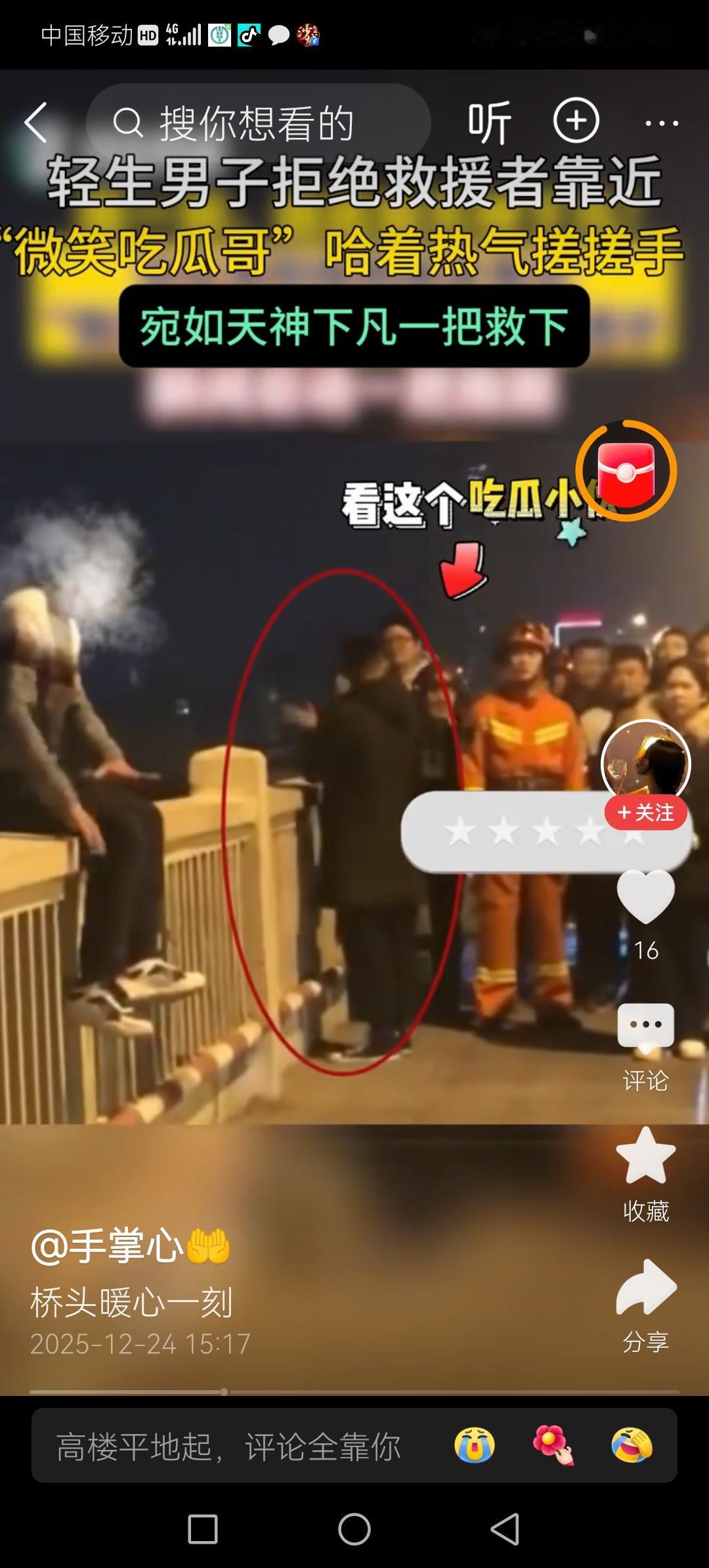 反转太快!湖南长沙一男子深夜站上高桥轻生,拒绝任何人靠近。一吃瓜小哥却在人群中“拍手叫好”。 这位吃瓜小哥始终露出“看热闹不嫌事大”的微笑,不仅让人心里感觉此人没有一丝一毫的社会责任感。 他时而笑着看看轻生的男子,时而看向站在一旁焦头烂额却不敢靠近轻生男子的消防员,似乎在传递着某些信息。 别人命悬一线,他却拍手叫好? 在轻生男子的呵斥下,围观群众和消防员只能不断后退。而这个吃瓜的小哥始终表现出一副“事不关己,高高挂起”的姿态,所以轻生男子也没有管他是否后退。 在众人和消防员都退到轻生男子以为安全的距离时,男子才终于放松了一些,原本站在高桥上的他坐了下来。 说时迟,那时快,刚刚一直微笑吃瓜还拍手叫好的小哥,三步并做两步冲上前去,一把将轻生男子从桥上拽了下来,消防员们见状迅速行动上前帮忙,成功救下轻生男子! 上一秒大家还在责怪小哥“看热闹不嫌事大”,殊不知小哥只是在伪装自己,他知道只有这样才能让轻生男子对自己放下警惕,才能更大几率找到机会救下他! 短短几分钟的时间,他从一个吃瓜群众,化身成为见义勇为的英雄!智勇双全的小哥,值得我们赞扬!湖南 对见义勇为者,应予重奖,您同意吗