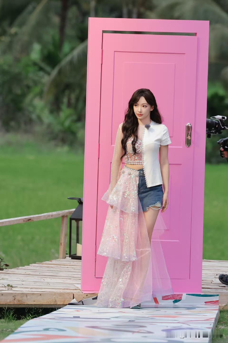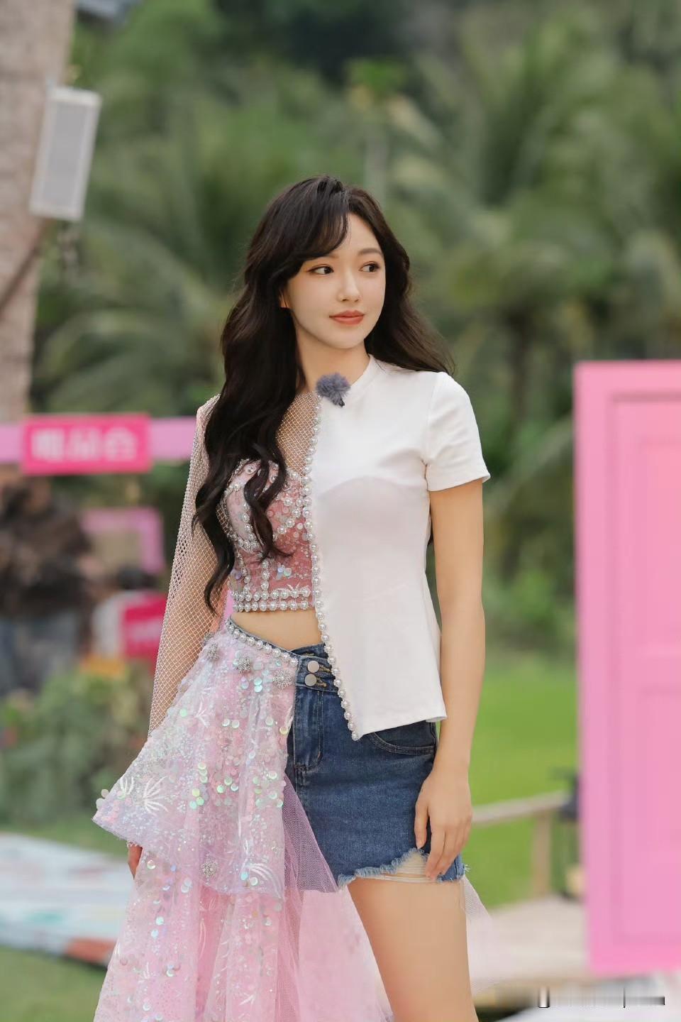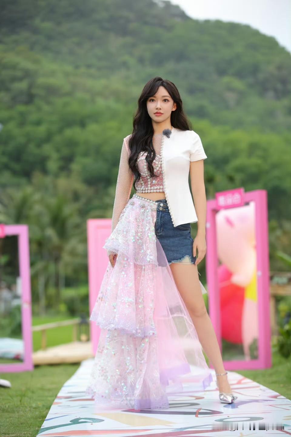 程潇这腿真是绝了! 又长又直线条还特别匀称,完全漫画里走出来的比例啊~ 她身材底子是真的顶,穿啥都像衣架子。 不过今天这身设计也太别致了! 左右完全不对称:一半仙气粉纱一半休闲牛仔,简直是把甜美和帅气同时穿身上了。 一般人肯定hold不住这种“撕裂感”混搭,但放在她身上居然意外很和谐——果然好身材就是最牛的时尚单品!