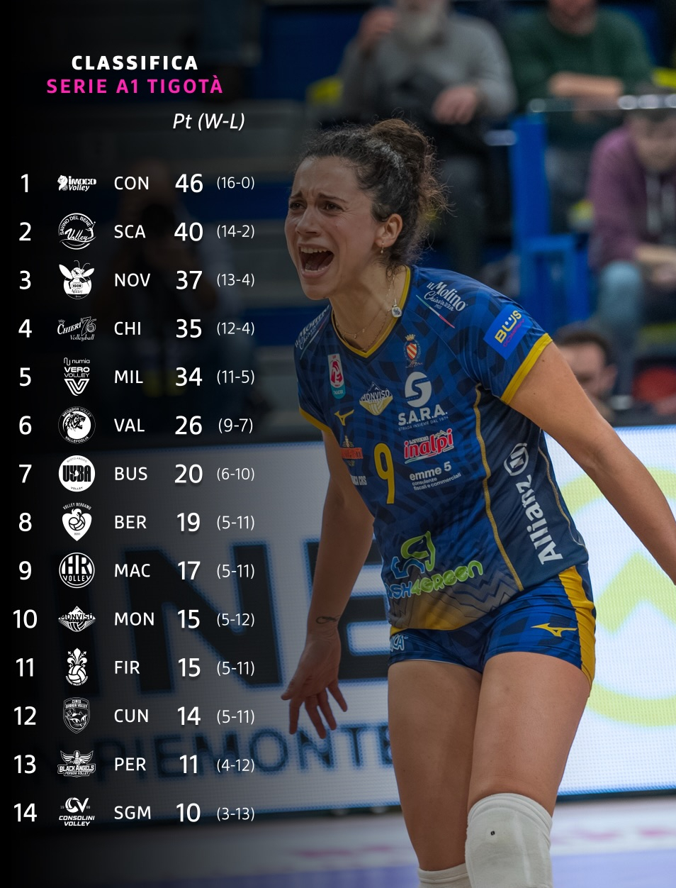 意甲本轮战绩和积分榜,科内利亚诺16战全胜领跑!朱婷