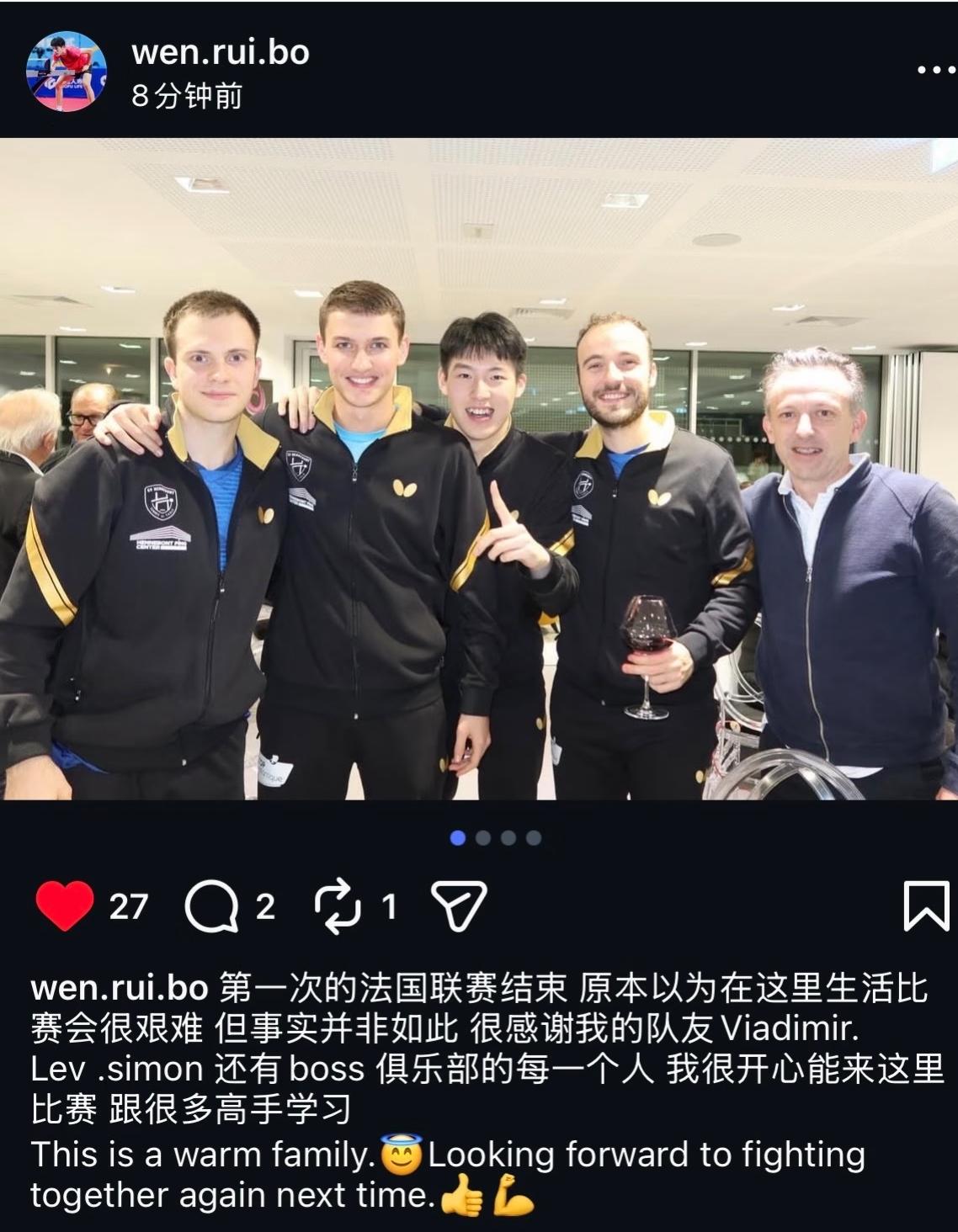 温瑞博更新:受伤以后才知道比赛对我有多么重要! 太急于求成,无法平静的思考, 打磨自己的技术, 前一段时间的失利, 仿佛撕碎我这一年的努力……. 通过法甲也能找到一点自信, 未来怎么样, 做好当下吧! 温瑞博 ,陈垣宇,徐瑛彬, 何卓佳,范思琦等国乒小将都出去 打德甲、法甲啦, 而且回来后,感觉外协的联赛 办的非常成熟, 乒乓球贵为我们的国球, 我们的联赛应该办的更好, 让更多热爱乒乓球运动的运动员 加入咱自己的联赛, 更利于乒乓球小将的成长, 在比赛中获得经验, 获得成长,更利于国乒的发展和 梯队建设!