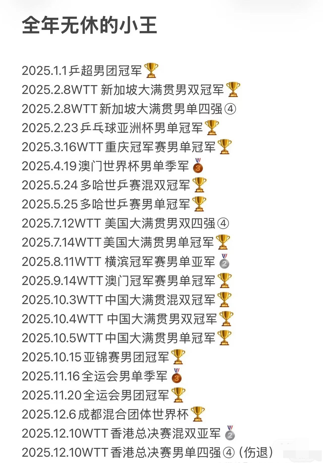 2025国际乒联年终世界第一公布: 女单世界第一孙颖莎, 男单世界第一王楚钦, 女双世界第一王曼昱/蒯曼, 男双世界第一 黄镇廷/陈颢桦, 混双世界第一 蒯曼/林诗栋! 全年无休的王楚钦 孙颖莎辛苦啦, 珍惜现役! 王楚钦 孙颖莎在哪一个位置都 能打,单打 团体 双打 混双, 而且成绩都是超级棒! 名副其实的全能王! 国乒运动员辛苦啦, 好好休息,好好调整, 马特在直播间透露, 孙颖莎 王楚钦正在好转, 静静等待他们恢复就好啦! 加油国乒!