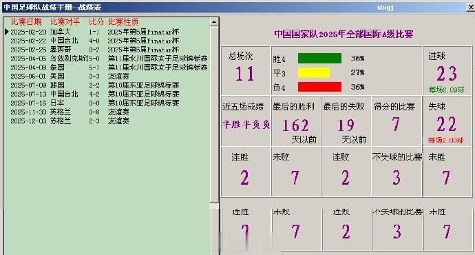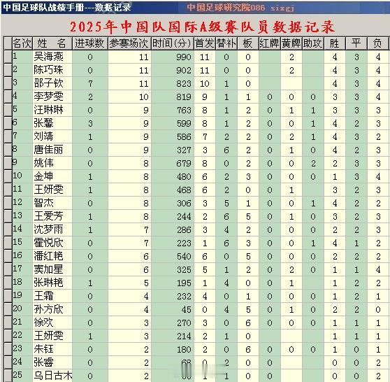 虎扑12月24日讯根据博主“sixgj”数据,2025年中国女足国家队国际A级赛出场纪录以及赛果显示,中国女足本年度共有39名球员出场,参与了11场比赛,取得A级赛4胜3平4负。