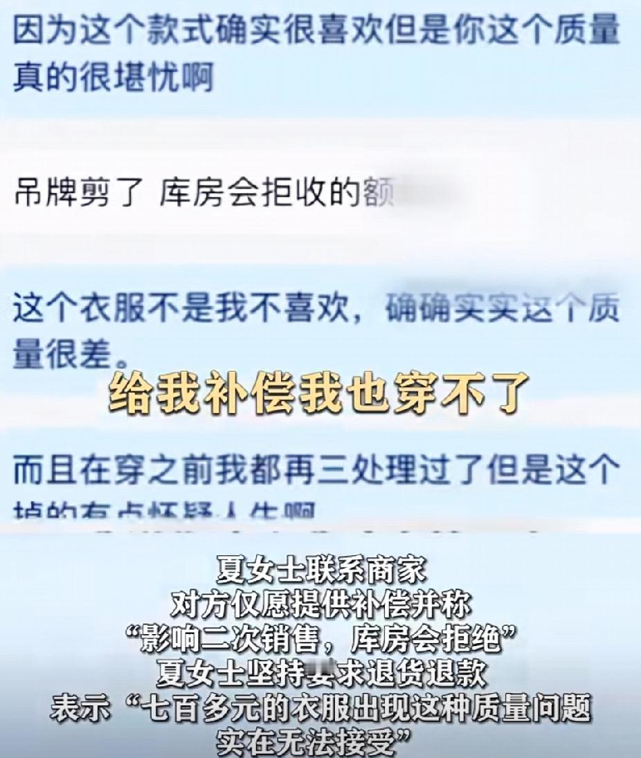 必须退!12月28日,四川宜宾的夏女士发视频称自己花728元网购的毛衣掉毛太夸张!夸张到什么程度呢? 据悉,夏女士收到这件毛衣的时候就已经发现了掉毛的问题。夏女士觉得新衣服有些碎毛毛很正常,于是夏女士将衣服上的毛毛简单的处理了一遍,才放心的穿在了身上。 结果将毛衣脱下的时候,夏女士惊讶地发现自己腿上全是毛衣掉下来的毛毛,简直就像穿了一层毛裤。这掉毛程度让夏女士无法接受! 夏女士联系客服,客服称可以给夏女士补偿,但夏女士觉得这件毛衣掉毛如此严重,就算给补偿自己也不愿意再穿了。于是夏女士提出了自己的诉求:“退货退款”! 但商家却装出自己很无辜的样子表示:“如果吊牌什么的剪掉了,仓库那边是会拒收的呀,没办法退货退款的。” 但夏女士觉得,如果是几十块钱的毛衣掉毛严重自己可以理解,但七百多的衣服出现如此严重的质量问题,没有办法穿出门。难道商家几句道歉和丁点补偿就让自己吃这哑巴亏吗? 于是夏女士坚持自己的想法,一定要退货退款!但商家拒绝怎么办呢? 对此,一位同样是网购平台商家的网友为夏女士出了一个主意。可以以质量问题为由提出平台介入,将质量问题图片发送给客服并描述具体的质量问题。这种情况下平台就会给消费者一个退货退款的通道,无论商家是否拒收退还的货物,货款都会退还给消费者。 真的是太夸张了!29.9的衣服掉毛都不一定这么严重吧,这明显就是拿便宜货卖高价!希望平台严查,惩罚无良商家! 网购踩坑