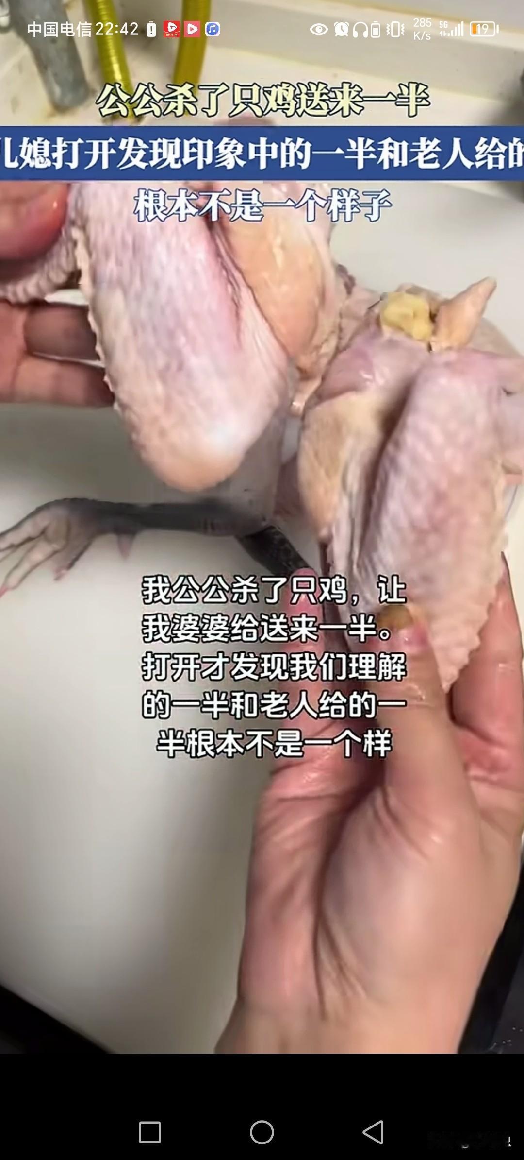 这公公太疼下一代人,杀一只鸡把精华的腿,翅留给儿媳,这样算是好公公了。 大部分吃鸡肉也是最看重这两个位置。 这是一位懂得年轻人的好公公。 自己留着鸡头,鸡屁股,鸡脖子,吃最不看好的位置。 这儿媳算是嫁到不错家庭了。