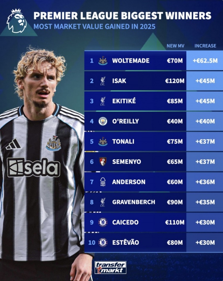 直播吧12月24日讯德转公布2025年英超球员身价上涨排行榜单,沃尔特马德上涨6250万欧位居首位。