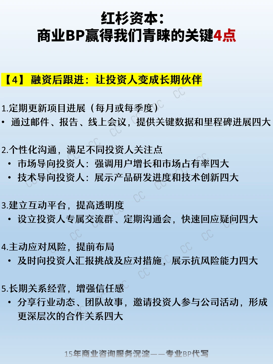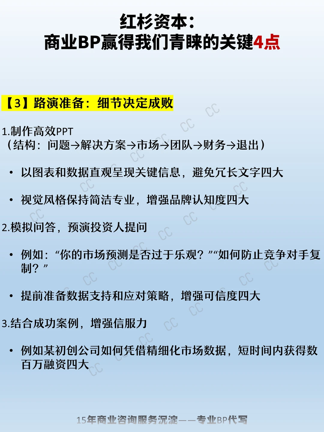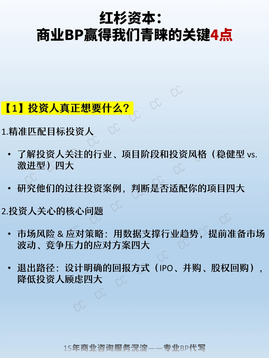 【1】投资人真正想要什么? 【2】打磨好商业计划书(商业BP) 【3】路演准备:细节决定成败 【4】融Z后跟进:让投资人变成长期伙伴 创业 融资 商业计划书 商业计划书ppt 红杉资本