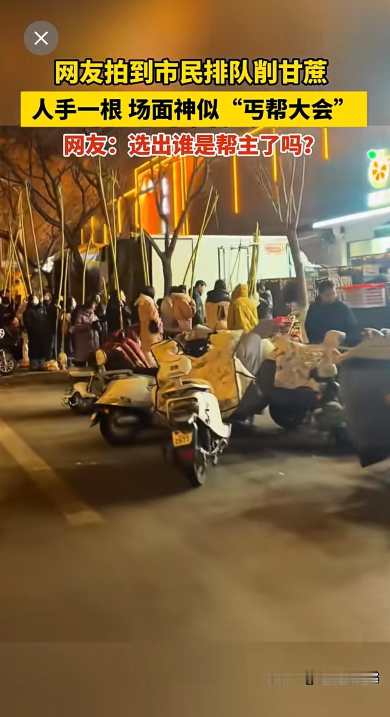 网友拍到市民排队削甘蔗,人手一根,场面神似“丐帮大会”。网友:选出谁是帮主了吗?
